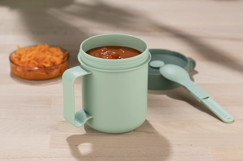 The NODSY soup container is a useful and practical gadget. This is a great solution to take soup with you, for example to work. It has a comfortable handle and a foldable spoon-fork attached. The container is suitable for use in microwave ovens, dishwashers and can also be frozen. Capacity 500 ml.