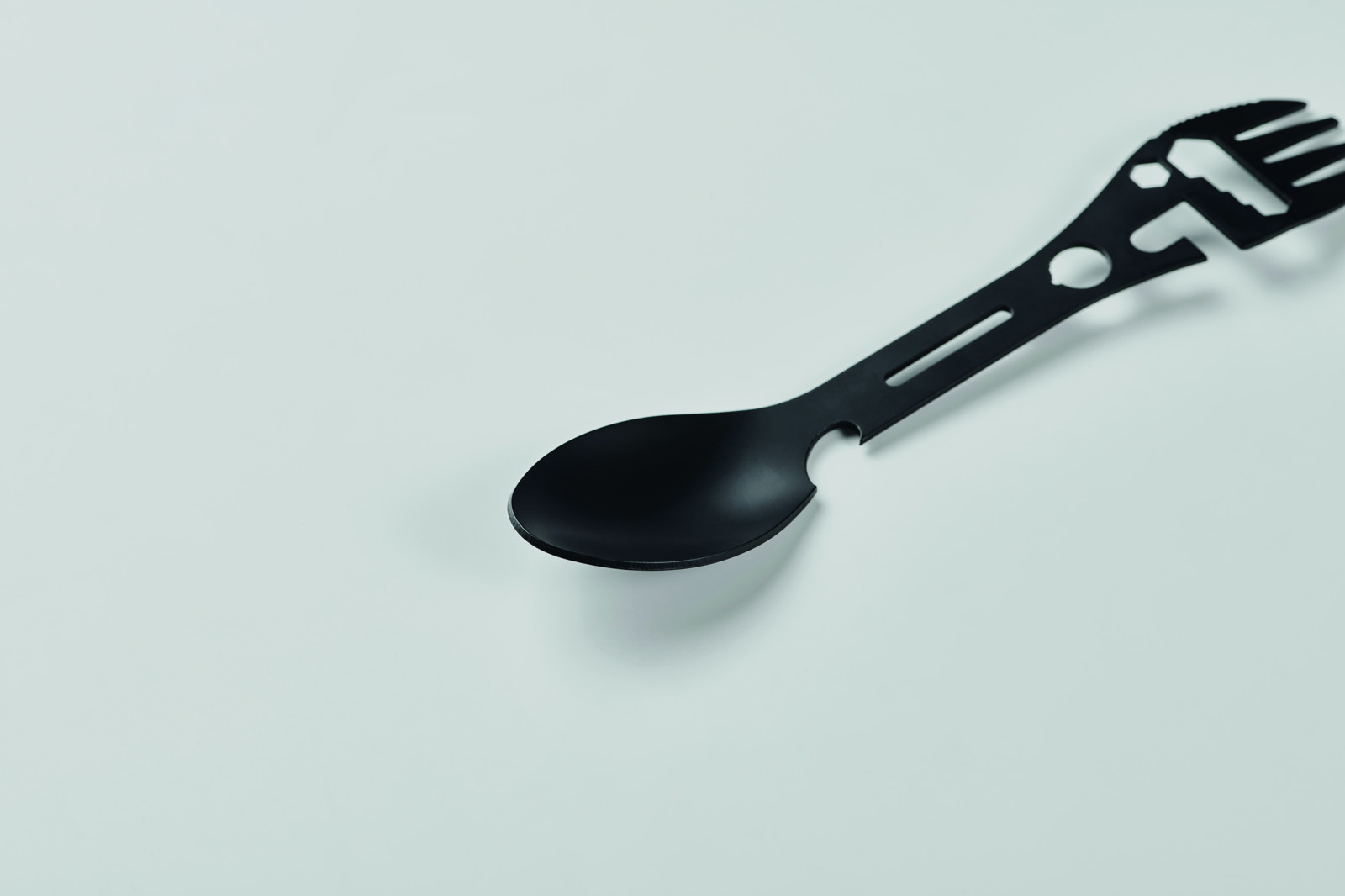 Stainless steel multi tool cutlery. Tools includes spoon, fork, adjustable wrench, bottle opener, hex key, serrated knife, opener and positioning wrench.