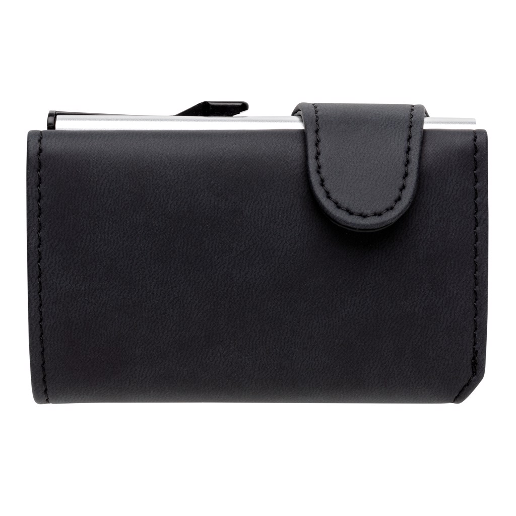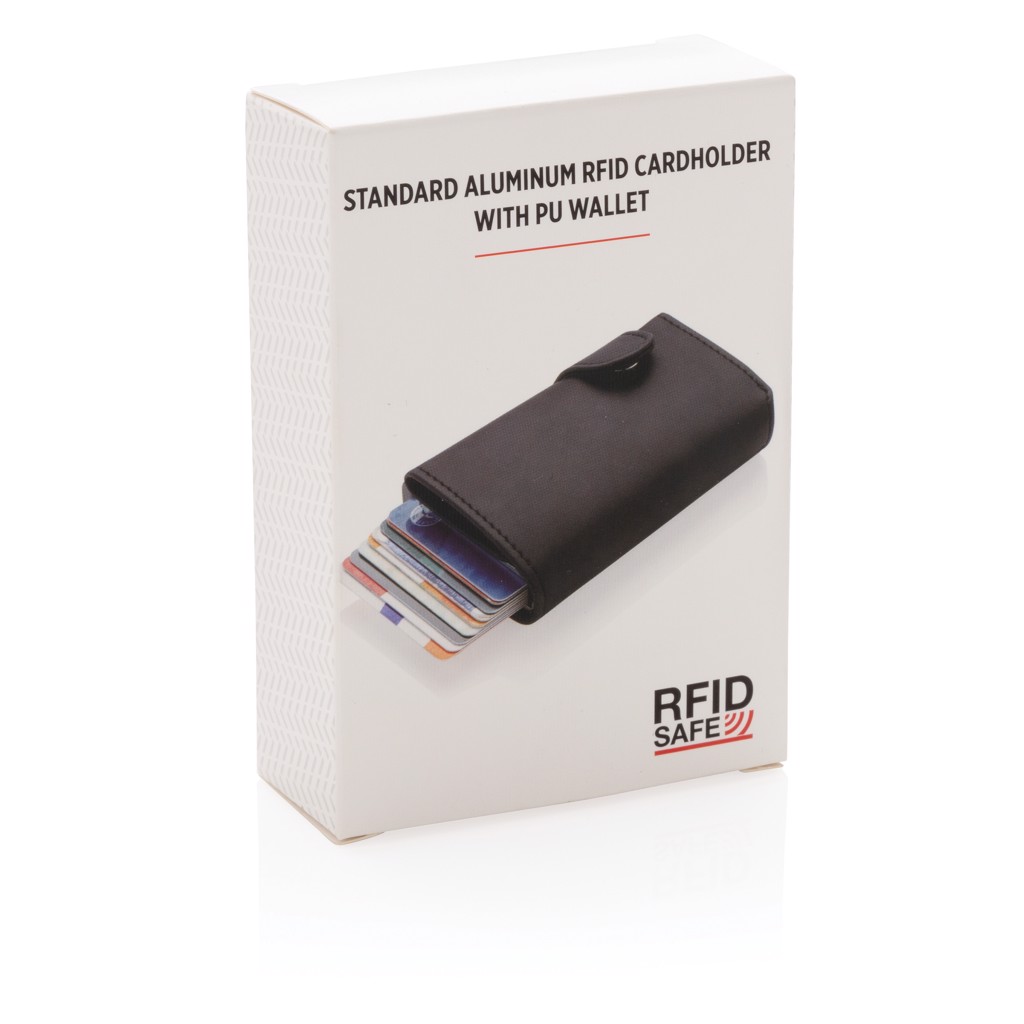 This solid aluminium cardholder with PU wallet protects your most important cards against electronic pickpocketing. No more broken or bent cards! It can hold up to 10 cards or 6 embossed cards. The easy side slider will push the cards up gradually. NFC (13.56 MHz) Blocking.