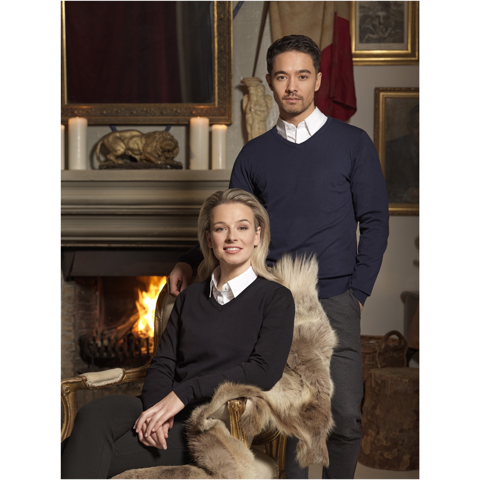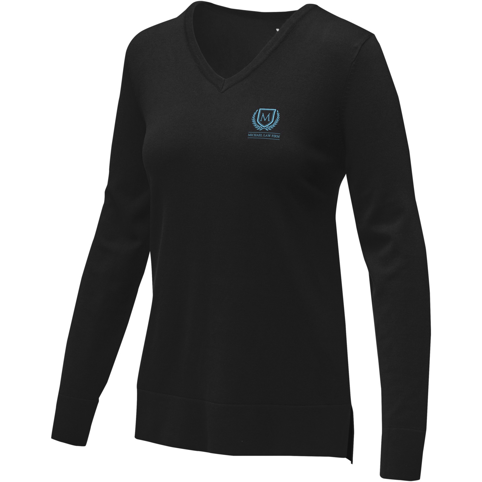 The Stanton women's v-neck pullover – a perfect blend of sophistication and a classic v-neck design. The flat knit rib collar, cuffs, and bottom hem not only elevate its aesthetic appeal but also offer lasting comfort. Made from a blend of viscose and nylon in a 12-gauge flat knit, this pullover strikes the perfect balance between style and functionality. This fine gauge results in a fabric that's smoother and more refined, perfect for both formal occasions and elevating your everyday ensemble. This pullover is designed with a fitted shape for a feminine look.