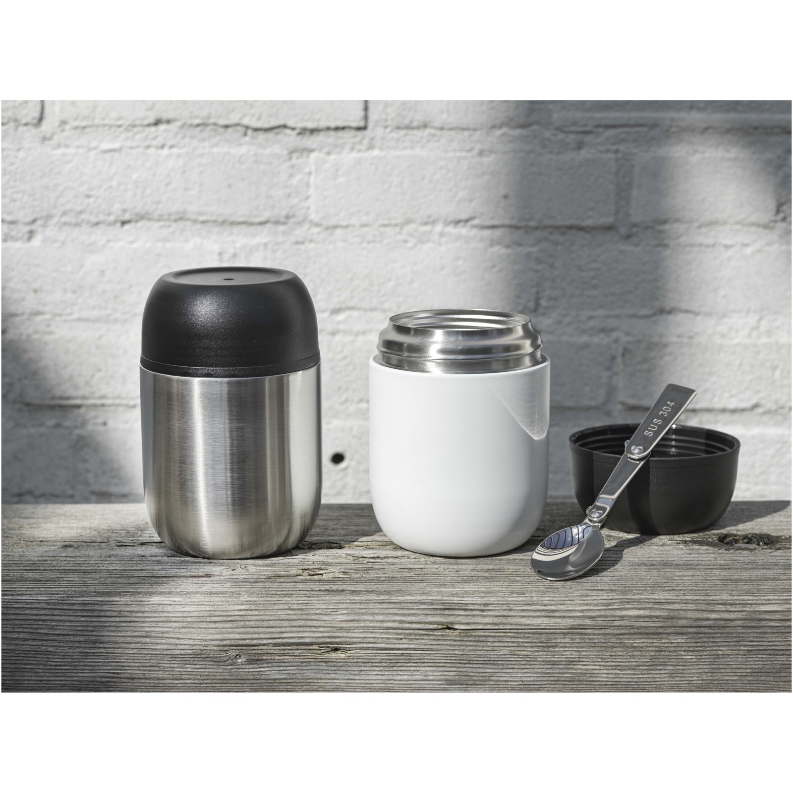 The Supo double-walled lunch pot is made of recycled stainless steel, making it a more sustainable choice compared to plastic and disposable lunch containers. Inside the lid, there is a convenient foldable spoon made of stainless steel, perfect for meals on the go. Each lunch pot is packed in a recycled kraft paper box. This item is not suitable for dishwasher or microwave. Capacity: 480 ml.