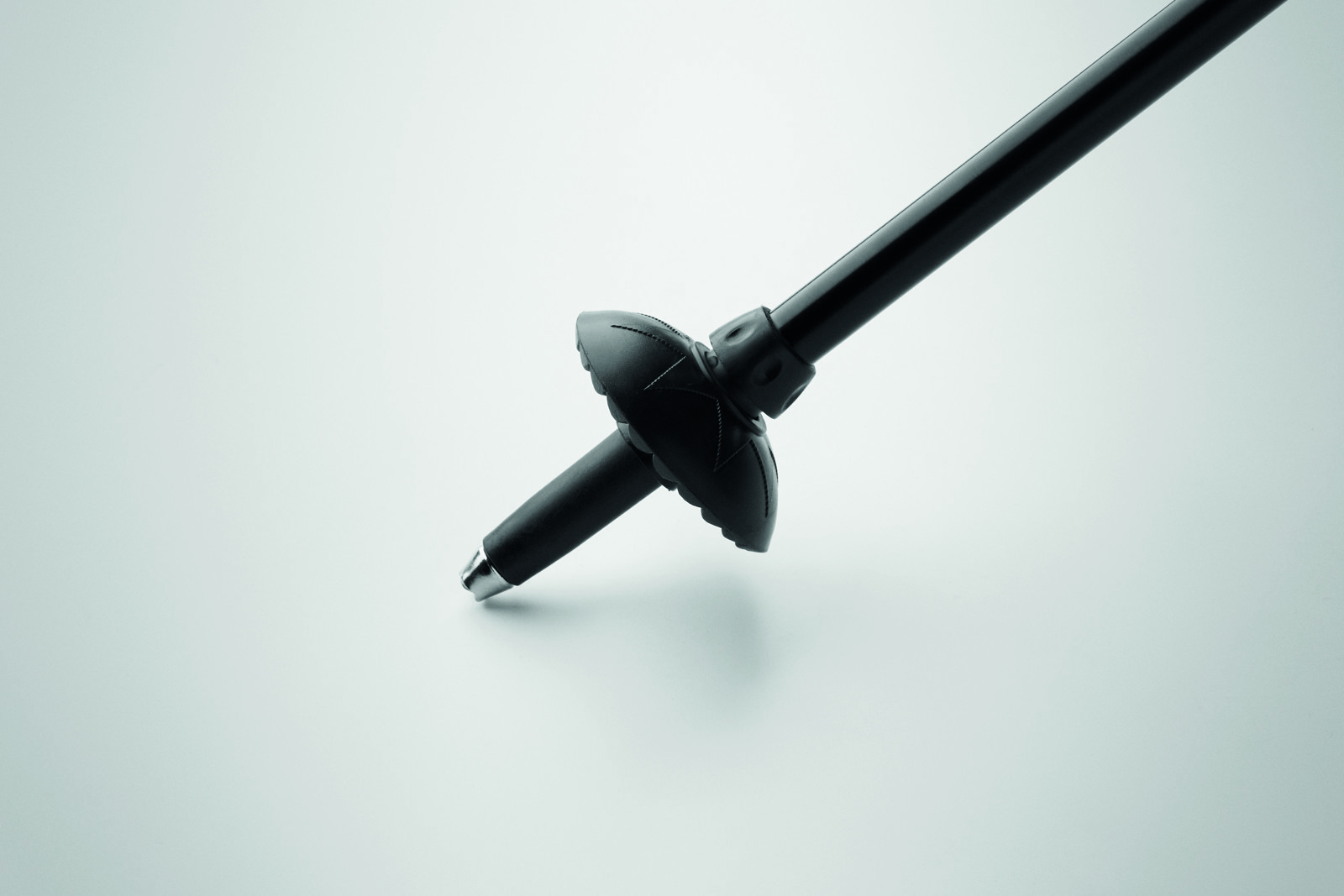Telescopic walking pole with EVA handle, wrist strap, rubber tip, and mud basket. Adjustable from 105 to 120 cm. Packed in RPET drawstring pouch. Lightweight and durable design.