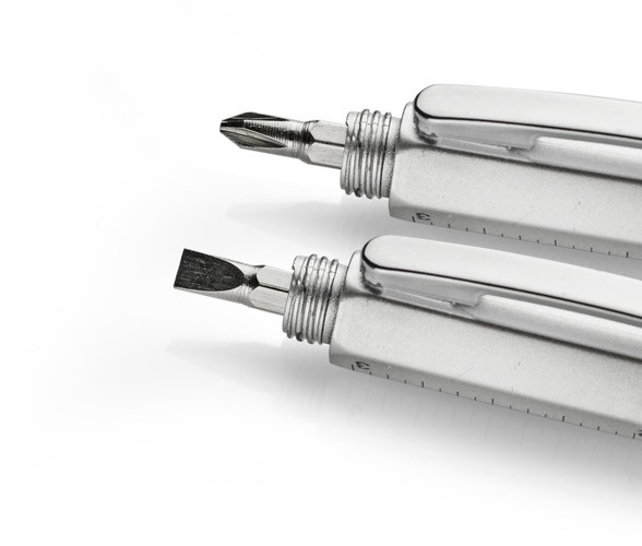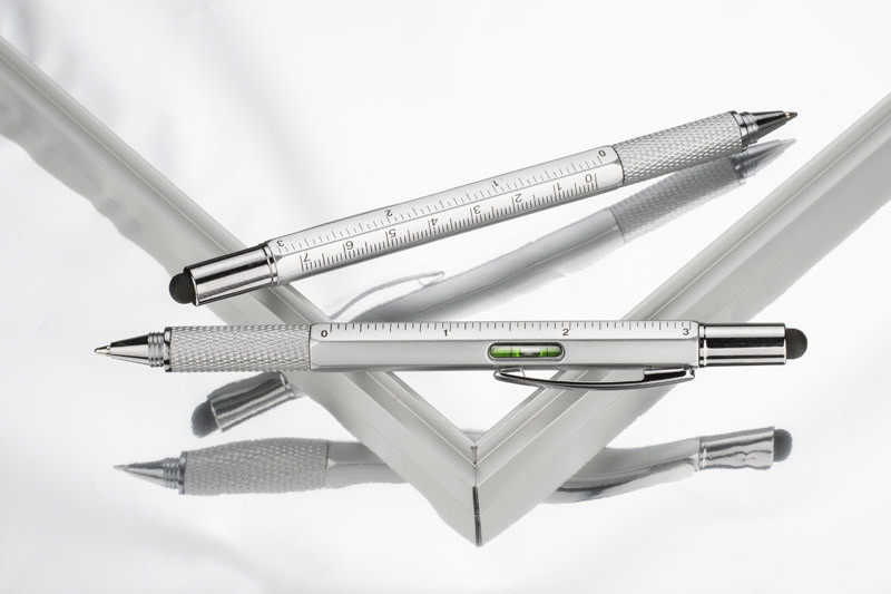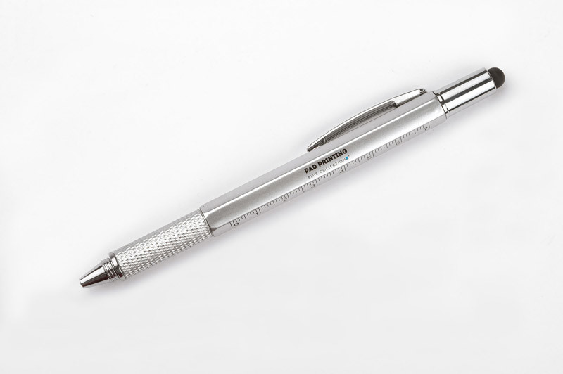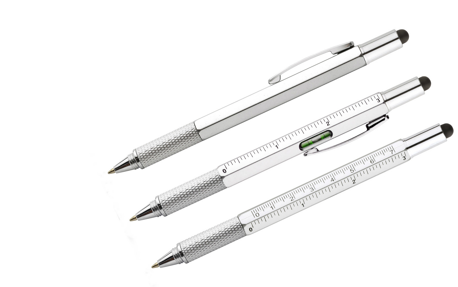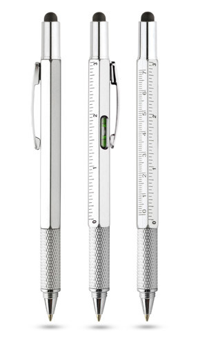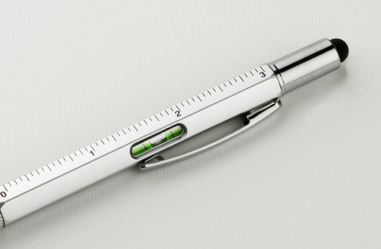 Multifunctional ball pen for every do-it-yourself enthusiast. There're two measures on item's body (centimeters and inches) and a spirit level. Under the cap wit touch pen there's another useful part - a compact screwdriver on magnets. Marking can be made on product's body