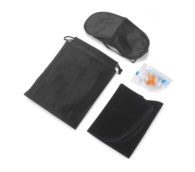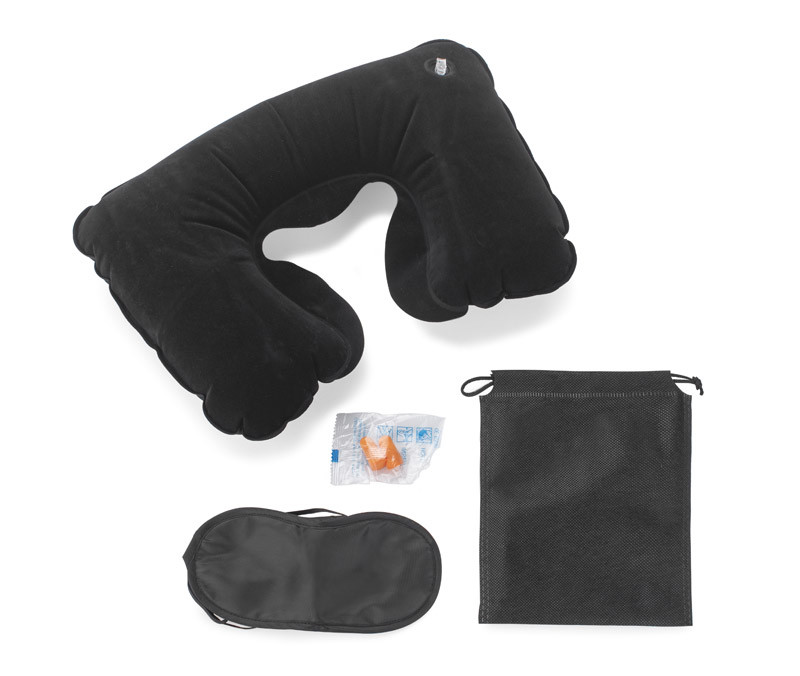 The CINO travel set consists of 3 elements: a blindfold, 2 earplugs and an inflatable pillow covered with a pleasant-to-touch material. It takes up little space, so this product can be easily packed into hand luggage. It is light and convenient to use. It will certainly make more than one trip more comfortable. The set is packed in a black bag.