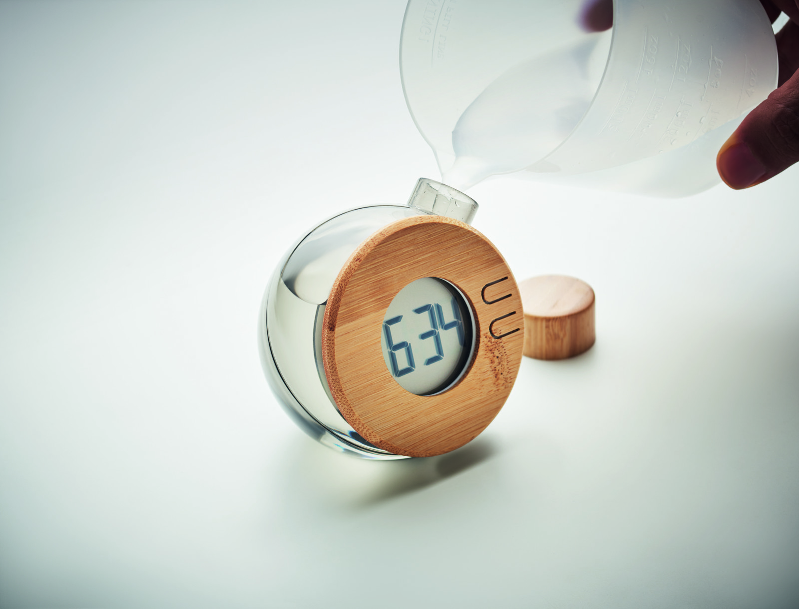 Large display LCD clock with bamboo details. To power this product, only add water and 3gr salt. 1 LR41 battery included for memory purposes. Bamboo is a natural product, there may be slight variations in colour and size per item, which can affect the final decoration outcome.