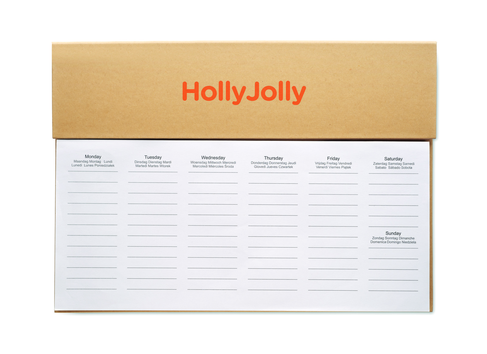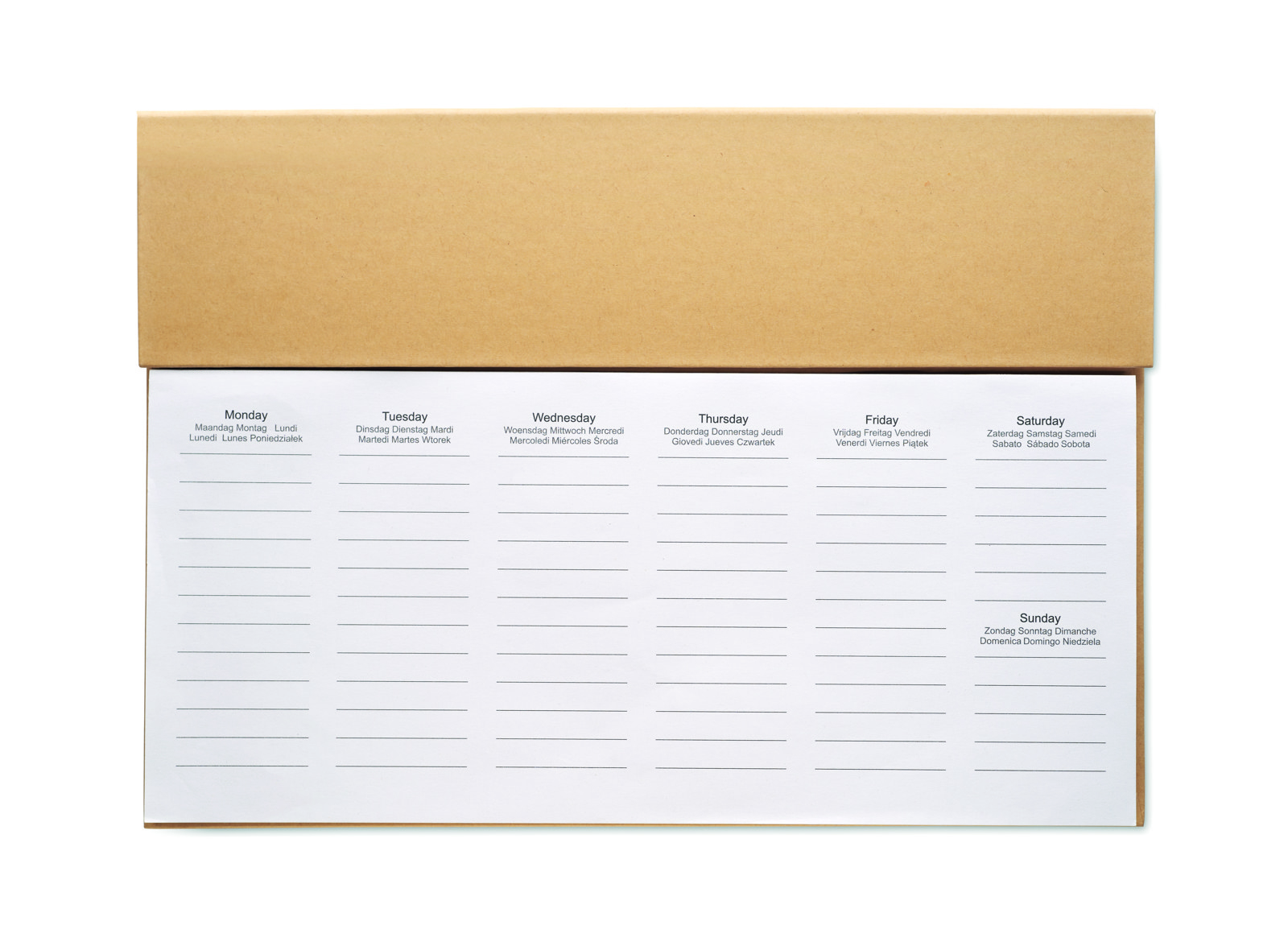 125 page weekly desk planner in 6 languages (EN/DE/FR/ES/IT/NL/PL) with kraft paper cover, carton barrel blue ink push button pen, wooden ruler and sticky note memo pad.