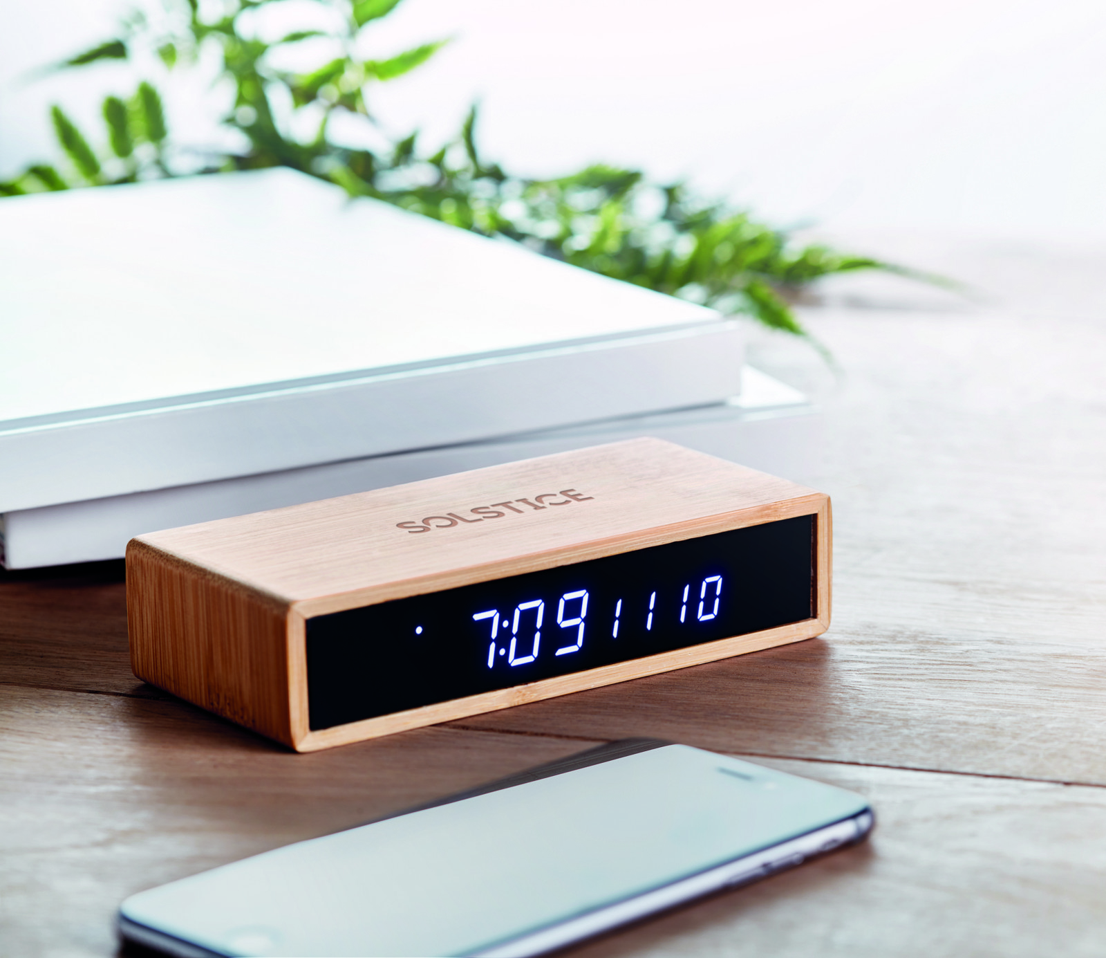 Wireless charger device including blue LED time display alarm clock and temperature in bamboo casing. AC-DC 2 pin plug adapter included. Wireless output: DC5V/1A (5W). Not suitable for UK use. Bamboo is a natural product, there may be slight variations in