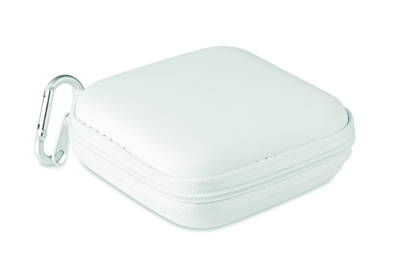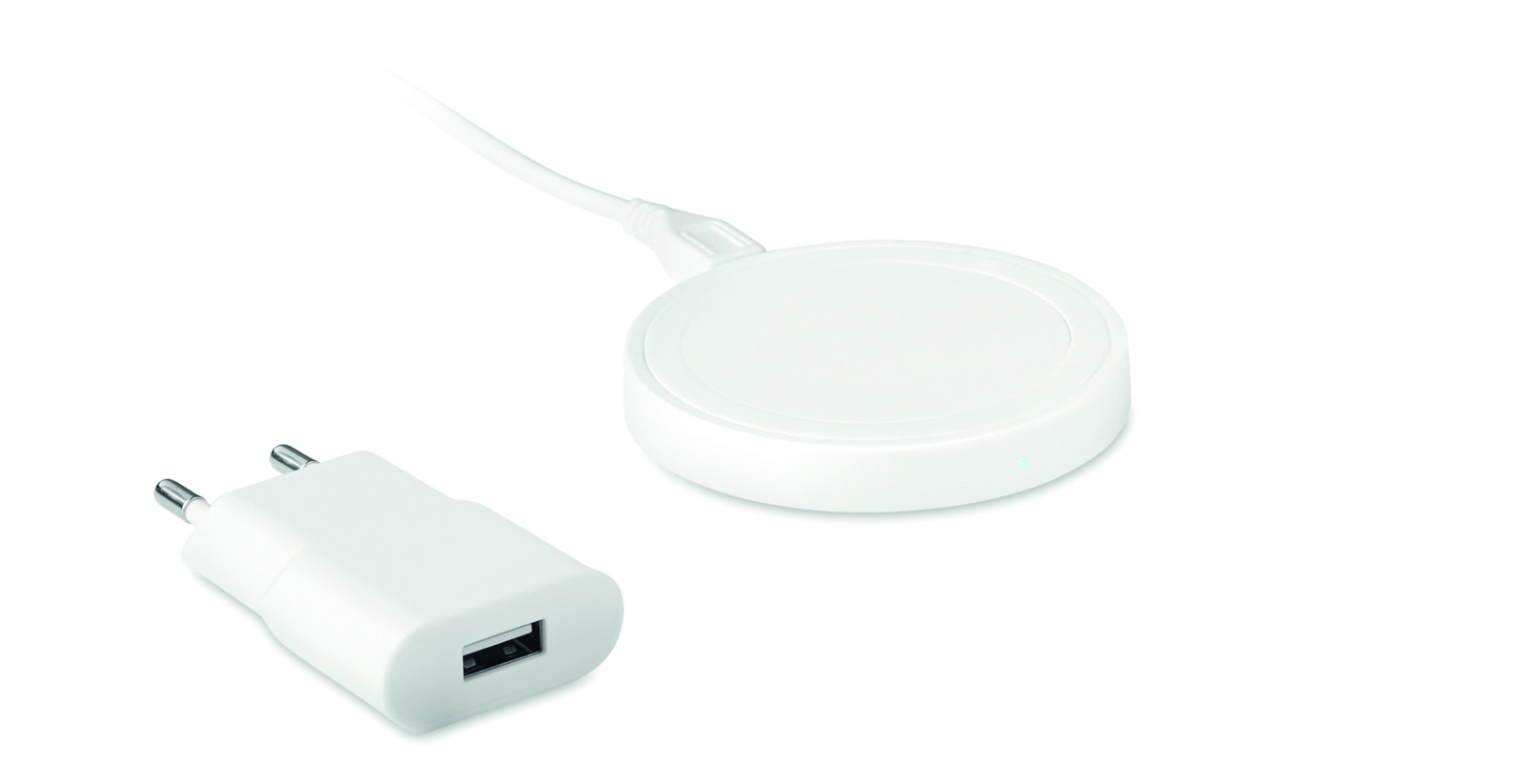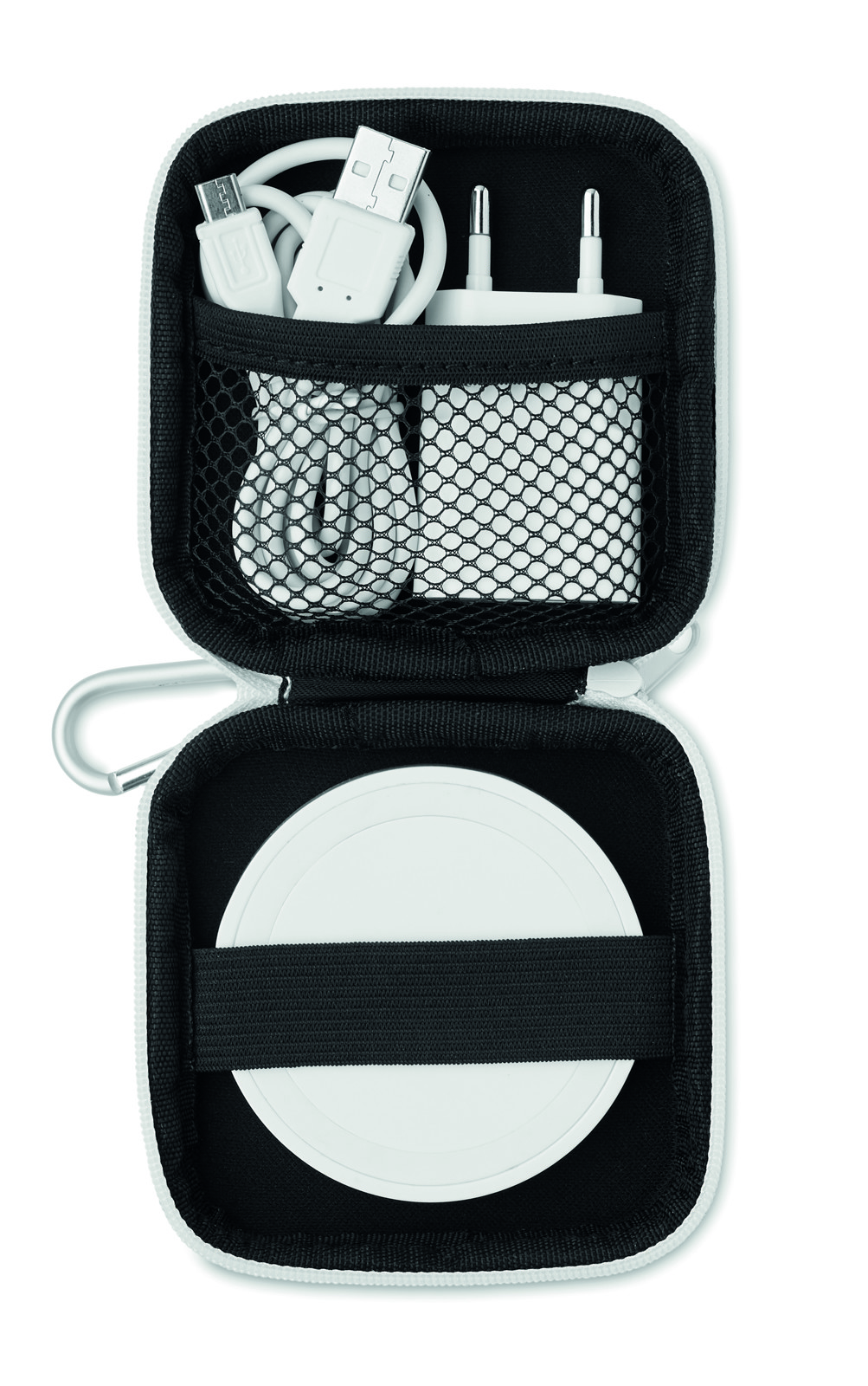 Set with wireless charger in ABS. Presented in EVA/ PU pouch. Contains EU plug and charging cable USB A to Micro B. Output data: DC9V/1.66A (5W).