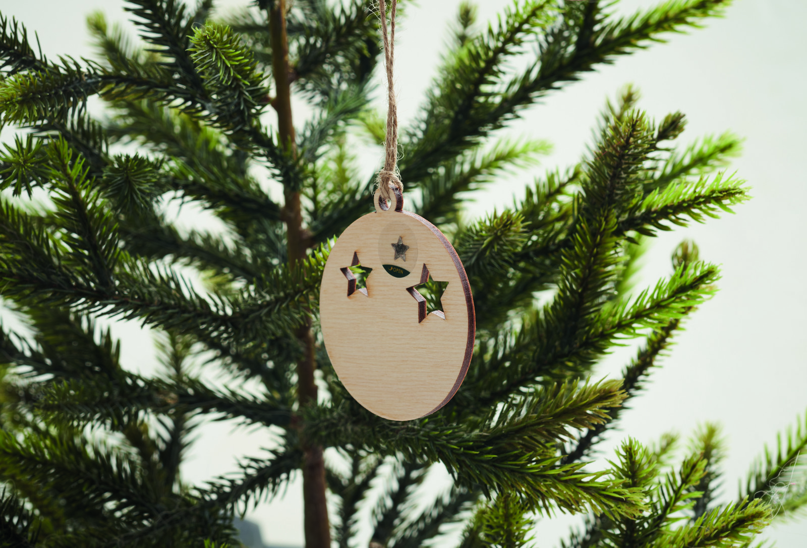 Wooden bauble shaped decoration hanger with jute cord including spruce seeds. Presented in kraft envelope. Made in EU.