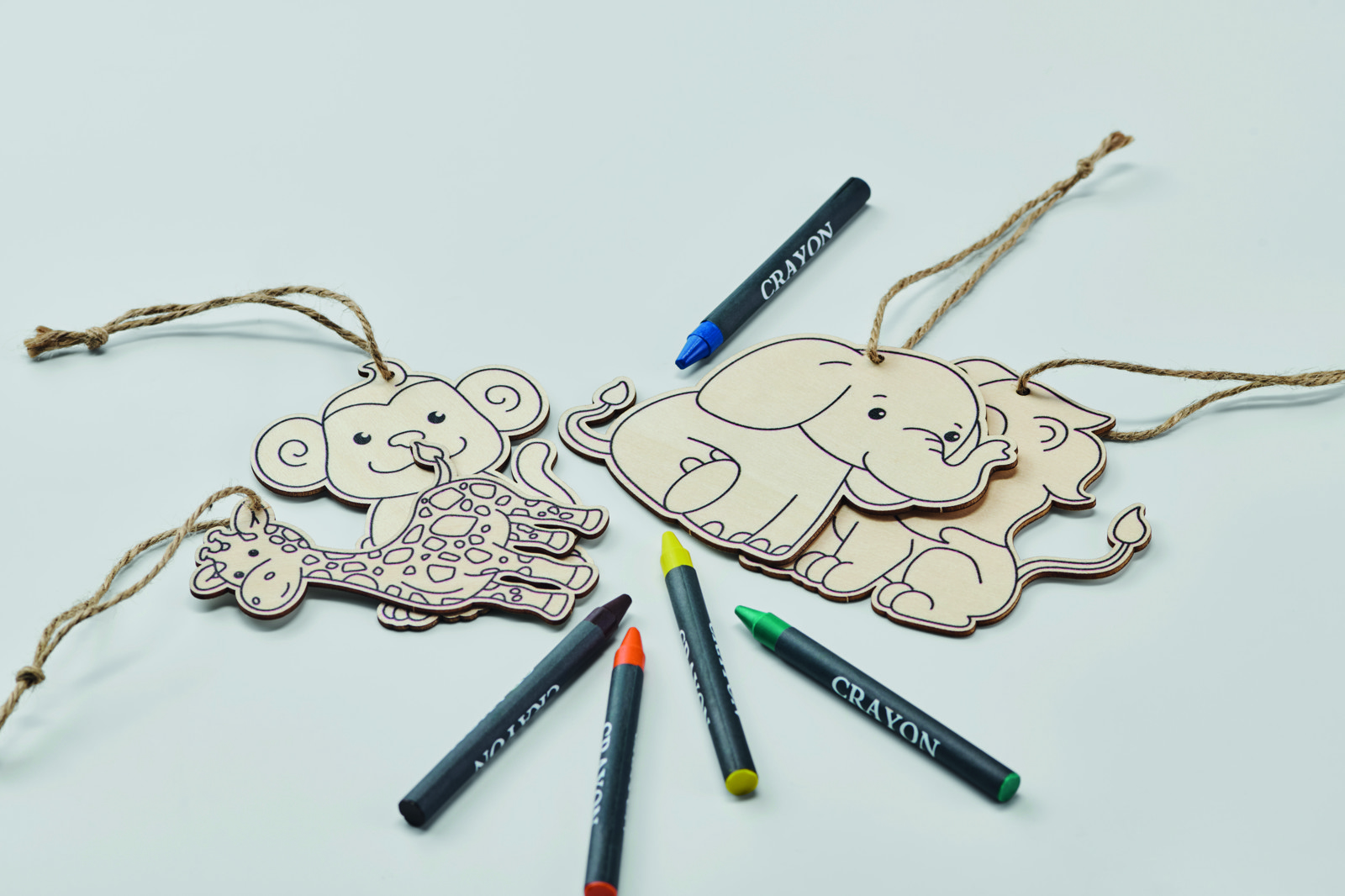 Painting set of 4 wooden hangers in animal design with jute cords and 5 crayons, all packed in non-woven drawcord bag. Ideal for creative play and decoration.