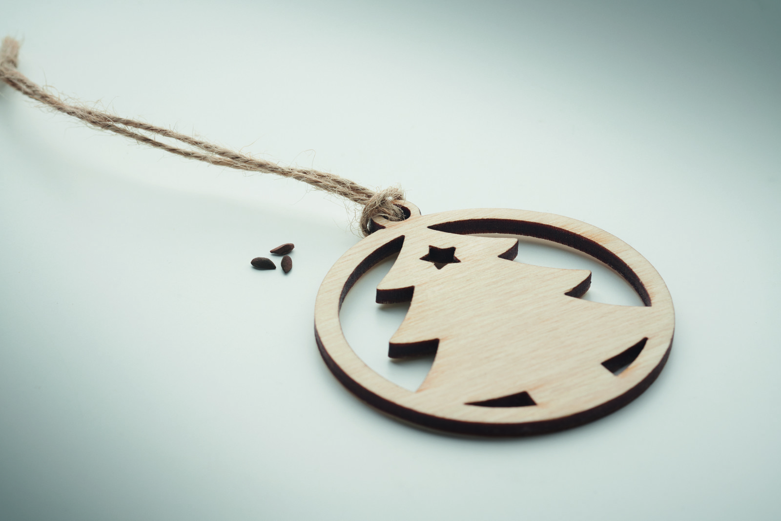 Wooden tree shaped decoration hanger with jute cord including spruce seeds. Presented in kraft envelope. Made in EU.