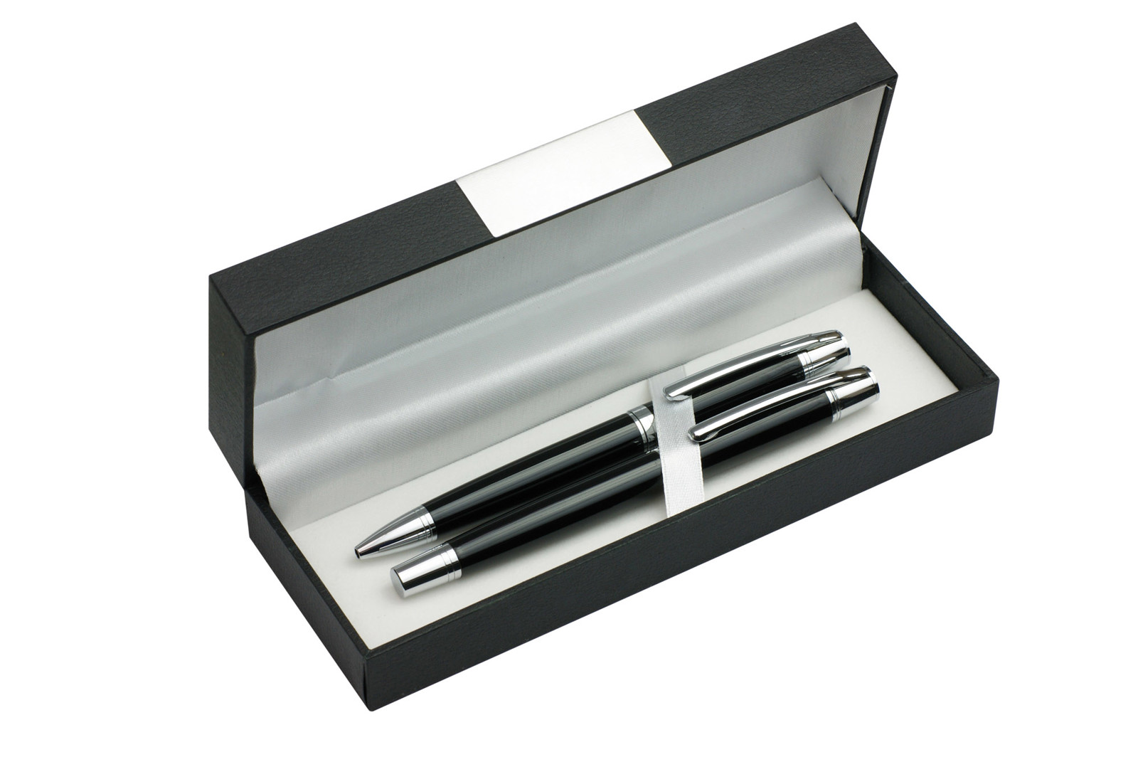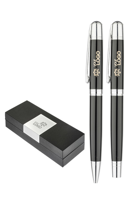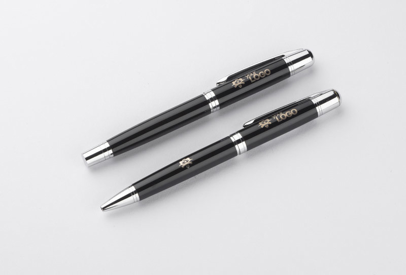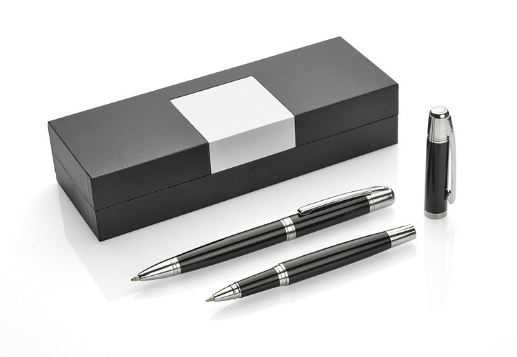 CALIFORNIA elegant writing set consisting of the ball pen and roller pen packed into a case. Logo might be engraved on the metal plate attached to the case.