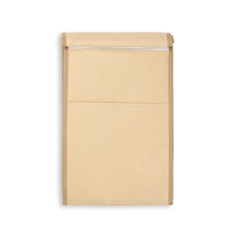 Paper cooler bag with adhesive closure, which keeps food fresh and well stored. Its unique design makes it easy to transport and store.Outer material: paper, with non-woven inner reinforcementThermal insulation: aluminum filmCapacity (L): 4Compartments: 1 padded main compartmentOuter pockets: 1 front pocket Closed: 195 x 350 x 110 mm | Open: 195 x 410 x 110 mm