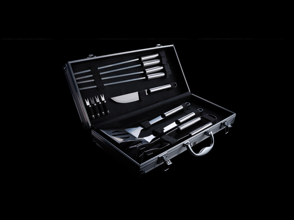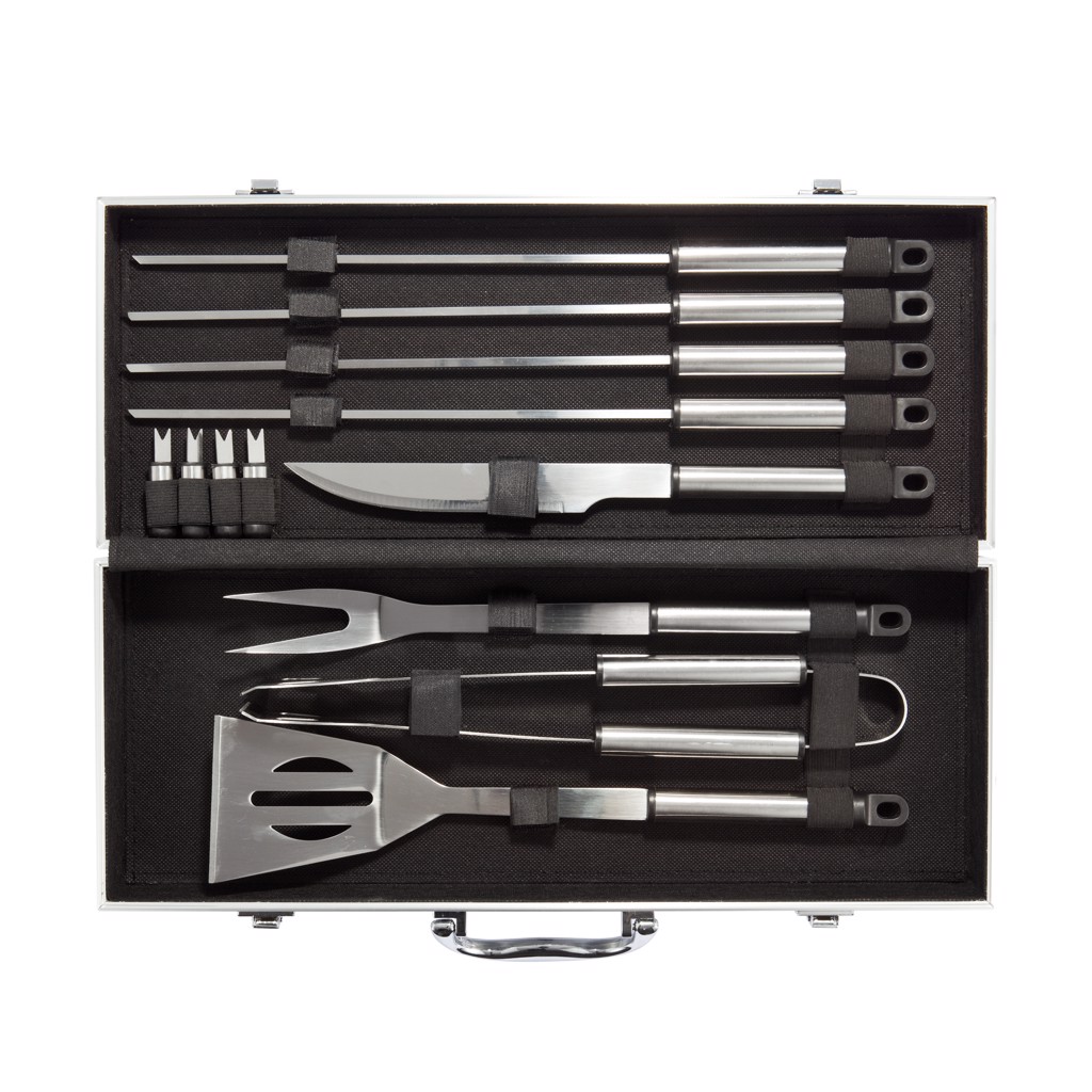 Avasta grillimise rõõm 12-osalise roostevabast terasest grillikomplektiga, mis sisaldab kõike vajalikku maitsvate grillroogade valmistamiseks. Komplektis on 4 varrast, nikerdusnuga, 4 maisihoidjat, spaatel, kaitsekattega nikerduskahvel ja tangid. Kõik need tööriistad on mugavalt pakitud hingedega alumiiniumkarpi, mis tagab nende kaitse ja lihtsa transportimise. Lisa oma logo sellele grillikomplektile ja too oma bränd suvegrillimise keskpunkti!
