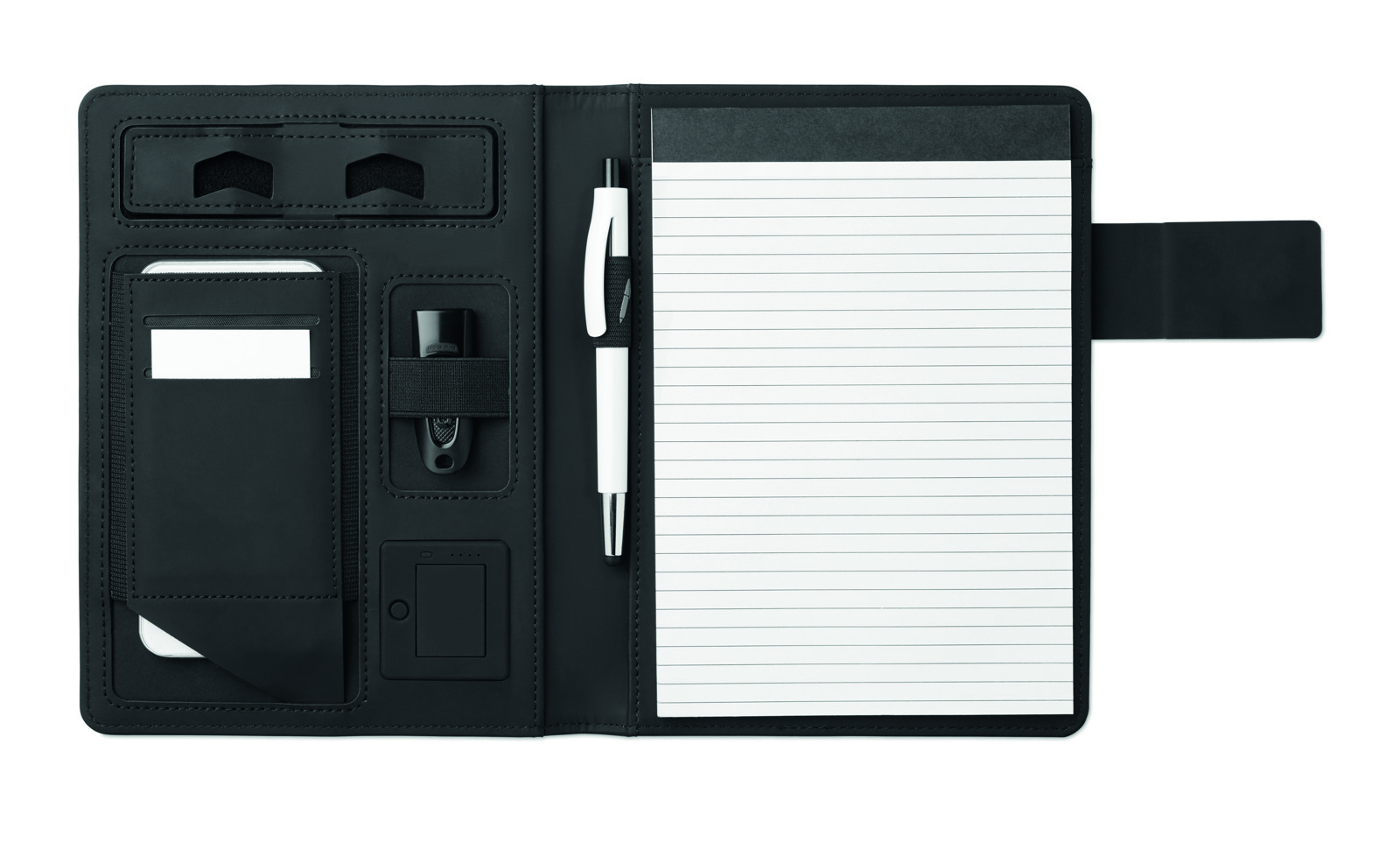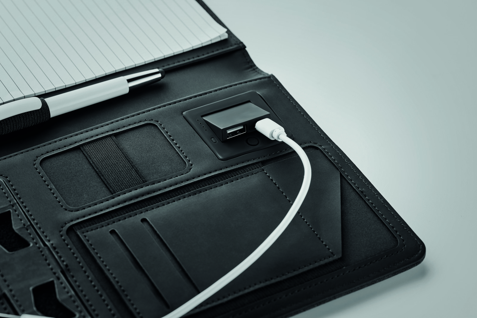 A5 formaadis konverentsimapp, millel on linane PU kaas. Varustatud 4000 mAh akupangaga, mis tagab nutiseadmete laadimise. Sisseehitatud mikro-USB C-tüüpi pistikuga. Mapp sisaldab 20 joonelise lehega märkmikku ning mitmeid sisemisi sektsioone organiseerimiseks. Magnetiline sulgur ja elastne pliiatsihoidja lisavad mugavust ja funktsionaalsust.