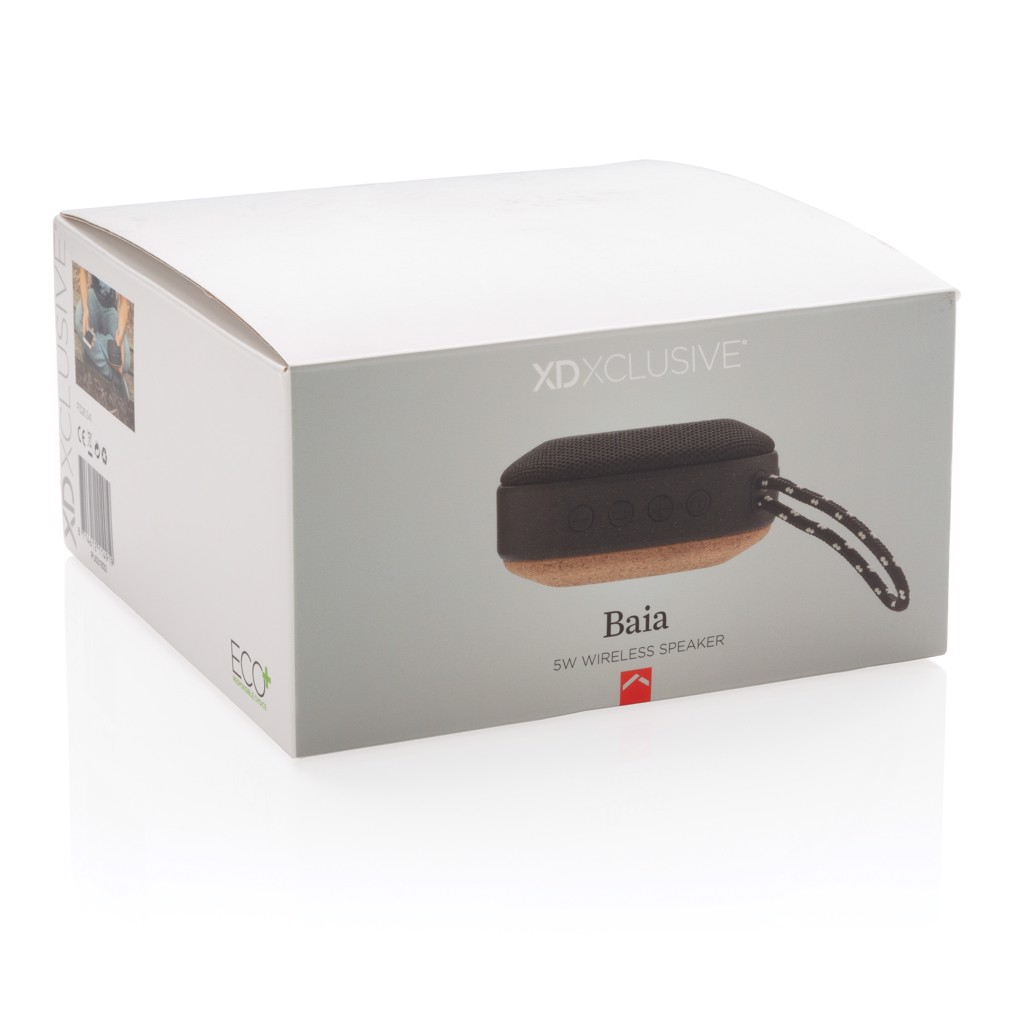 Säästlik 5W juhtmevaba kõlar, mis on valmistatud hoolikalt valitud materjalidest. Kõlar on kaetud vastupidava veekindla kangaga ning selle põhi on valmistatud looduslikust korgist. Baia pakub erakordset helikvaliteeti ja sügavat bassi, olles ideaalne kaaslane aias või rannas tänu IPX5 veekindluse reitingule. Bluetooth 4.2 tehnoloogia tagab lihtsa ühenduse ning 1000 mAh aku võimaldab muusikat nautida kuni 8 tundi järjest. Töökaugus ulatub kuni 10 meetrini. Tarbetute jäätmete vähendamiseks on Baia pakitud plastikuvabasse pakendisse. Registreeritud disain®
