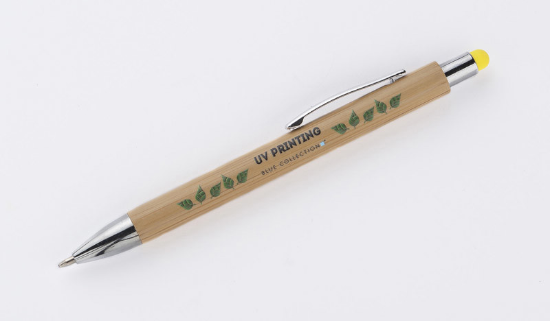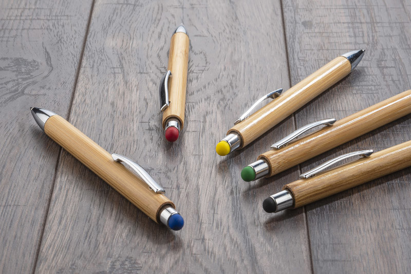 Body of TUSO is made entirely of bamboo. Chrome finishes give add to its elegance. The colorful tip designed to use with touch screens is an interesting decoration. Automatic ballpoint pen. G2 type refill in blue.