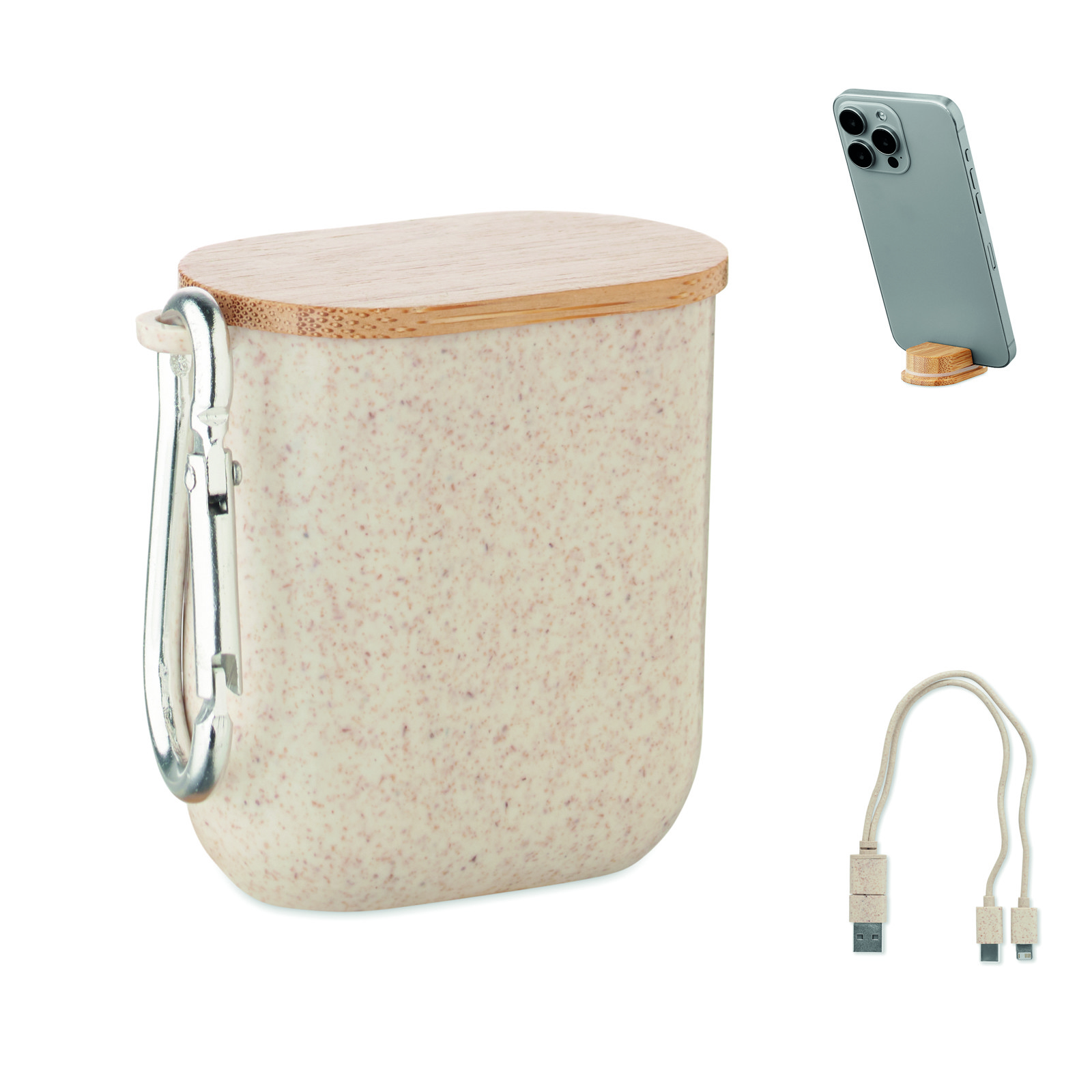 Cable set in wheat straw/ABS case with bamboo top and carabiner. Lid serves as phone stand (in horizontal position). Cable input 2in1 USB-C/A, output Type-C and 2 in 1 pin.