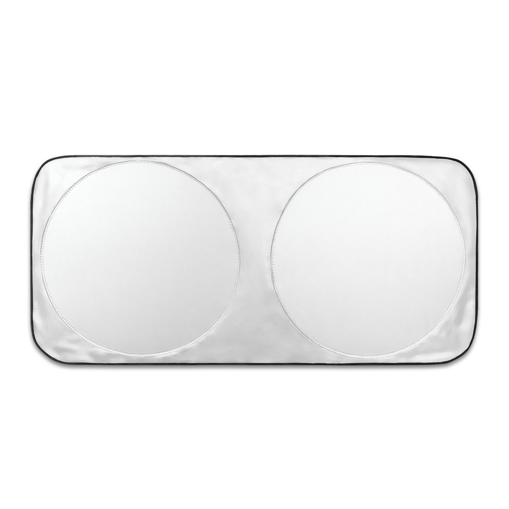 Car sun shade made of 210D polyester with two circular areas measuring 65 cm in diameter. This innovative shape is ideal for hotter days. Supplied in a 210D polyester bag, it's round for easy storage. 1500 x 700 mm