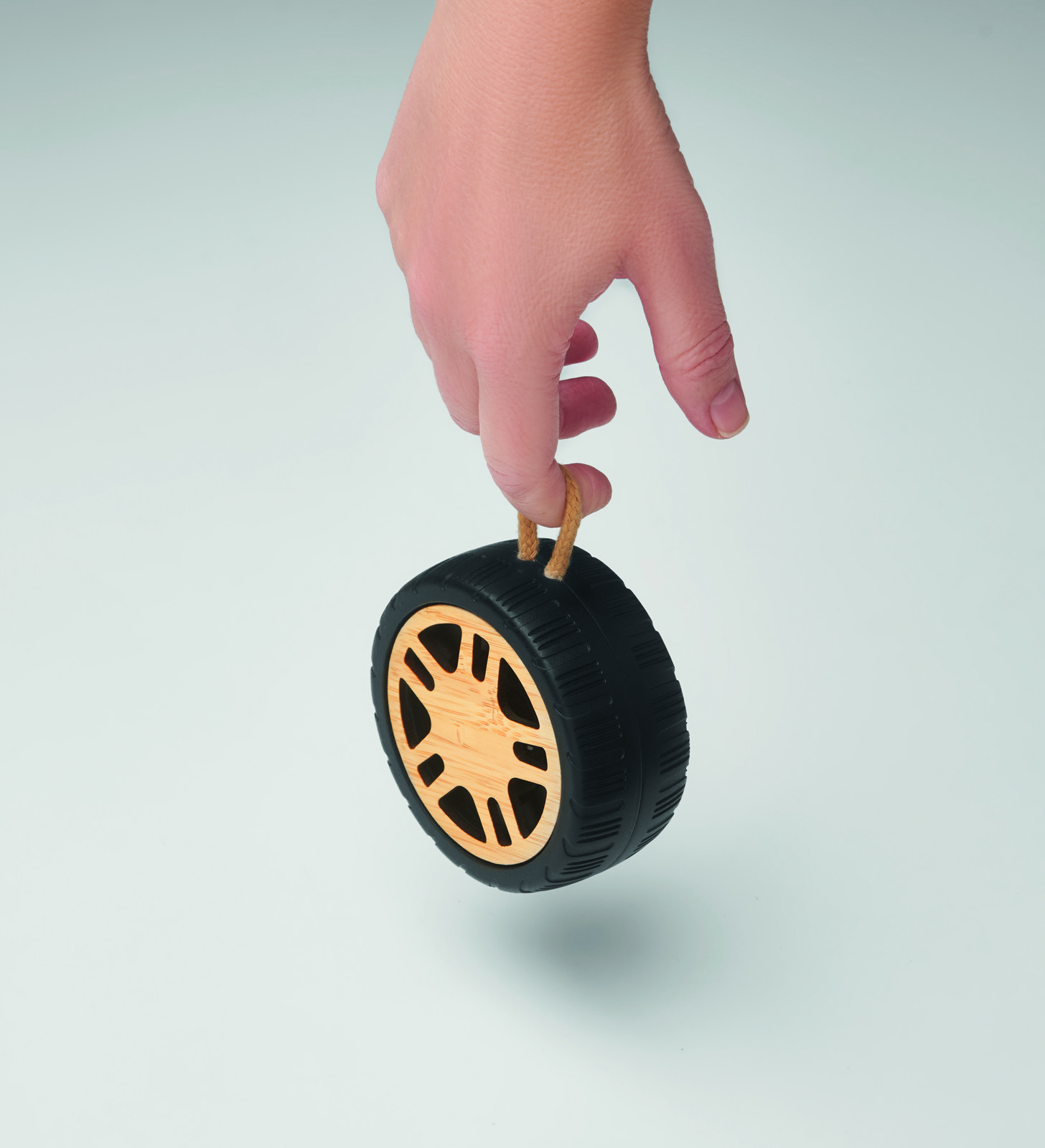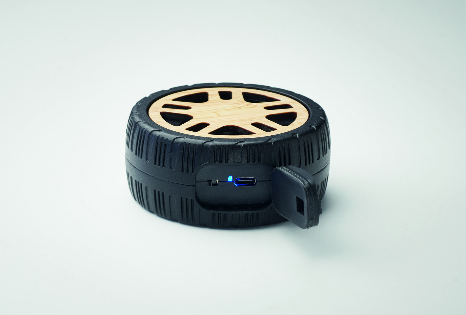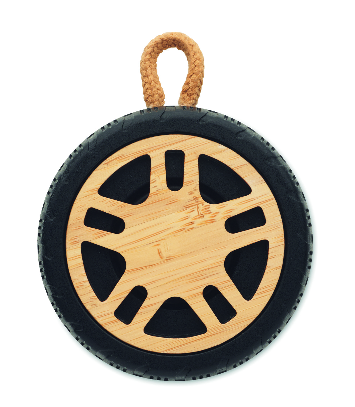 Rehvikujuline juhtmevaba 5,3 W kõlar on valmistatud taaskasutatud ABS-materjalist, millel on bambusest detail ja puuvillane köie käepide. 400 mAh taaslaetav aku tagab pika mängimiseaja. See ainulaadne kõlar on ideaalne valik, et tuua oma ettevõtte logo esile ja jagada oma brändi sõnumit igal pool.