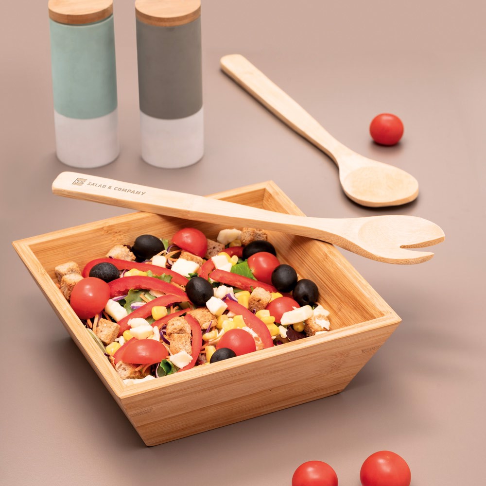 Kandiline bambusest salatikauss on ideaalne valik, et serveerida värskeid salateid nii kodus kui ka restoranis. Koos Salvy komplektiga, mis sisaldab kahte bambusest salatite serveerimise riista, loob see kauss teie söögilauale elegantsuse ja stiili. Toode on valmistatud looduslikest materjalidest, mistõttu võib värv ja trükitulemus erineda erinevate toodete vahel. Kausi mõõtmed on 214 x 214 x 70 mm, mis teeb selle praktiliseks ja ruumisäästlikuks lahenduseks. Telli oma logoga ja too oma bränd esile igas toidukorras!