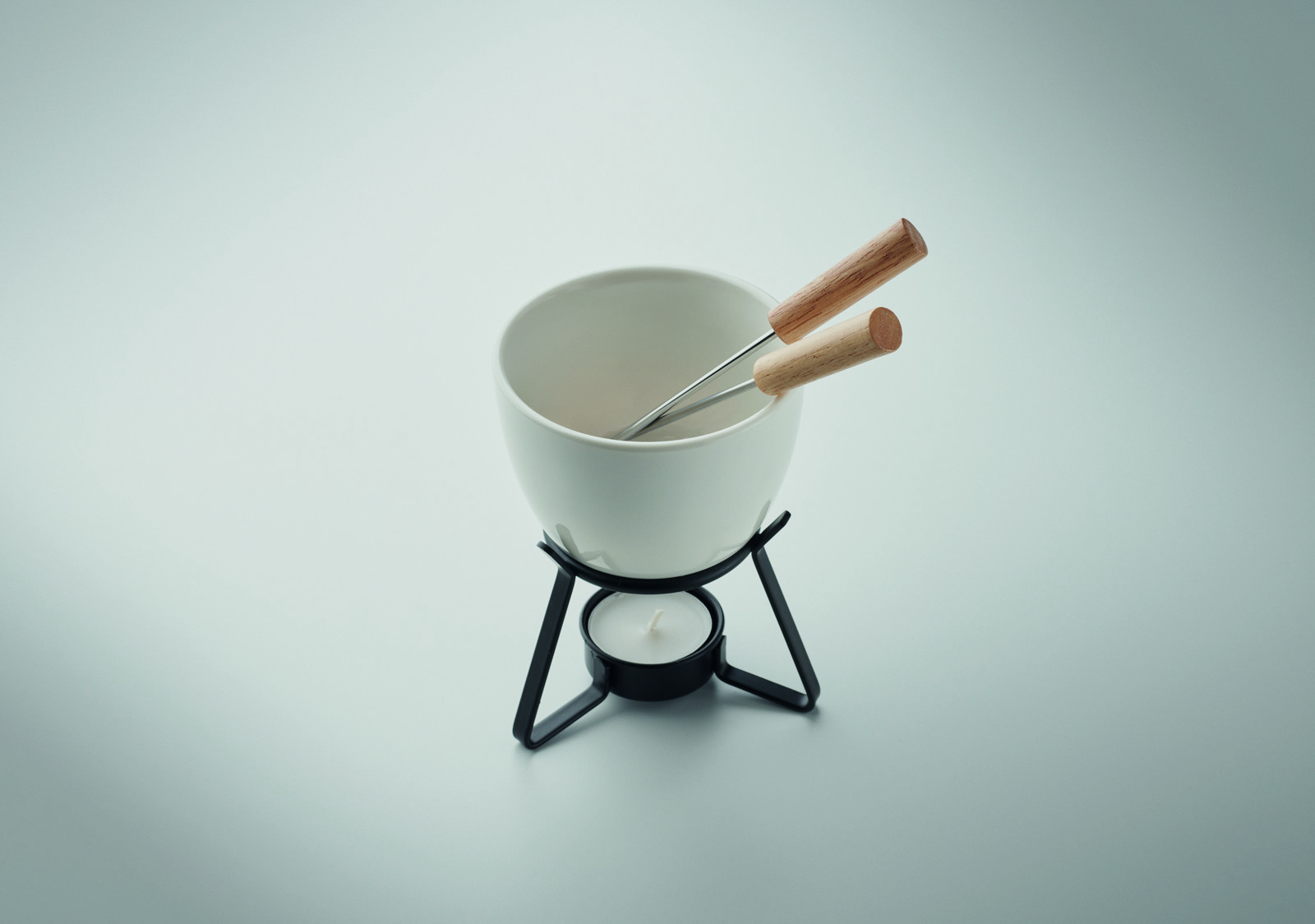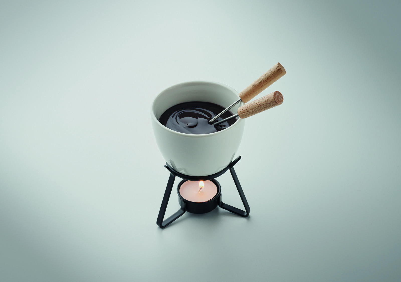 Nautige romantilisi õhtusööke või toredaid koosviibimisi sõpradega selle väikese keraamilise fondüükomplektiga, mis on mõeldud kahele. Komplekt sisaldab kahte puidust käepidemetega metallist kahvlit, mis muudavad fondüü nautimise mugavaks ja stiilseks. Teeküünal ei kuulu komplekti, kuid selle lisamine loob toreda atmosfääri. Mahutavus: 240 ml. Telli nüüd ja lisa oma logoga isikupära igasse toiduelamusse!