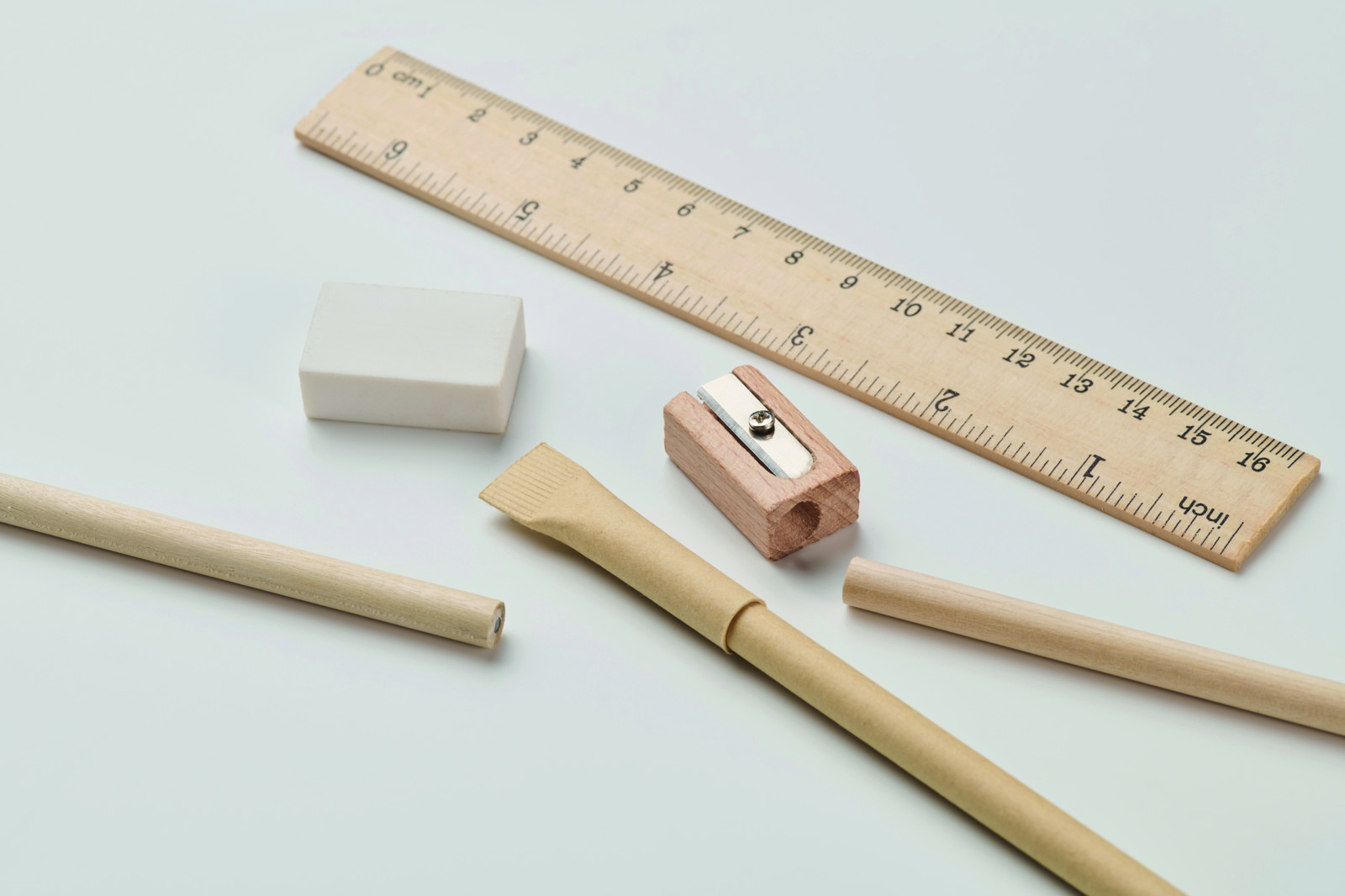 Pabertorukarbis kirjatarvete komplekt, mis sisaldab kahte pliiatsit, ühte papist korpusega pliiatsit, ühte puidust teritajat ja ühte kustutuskummi.