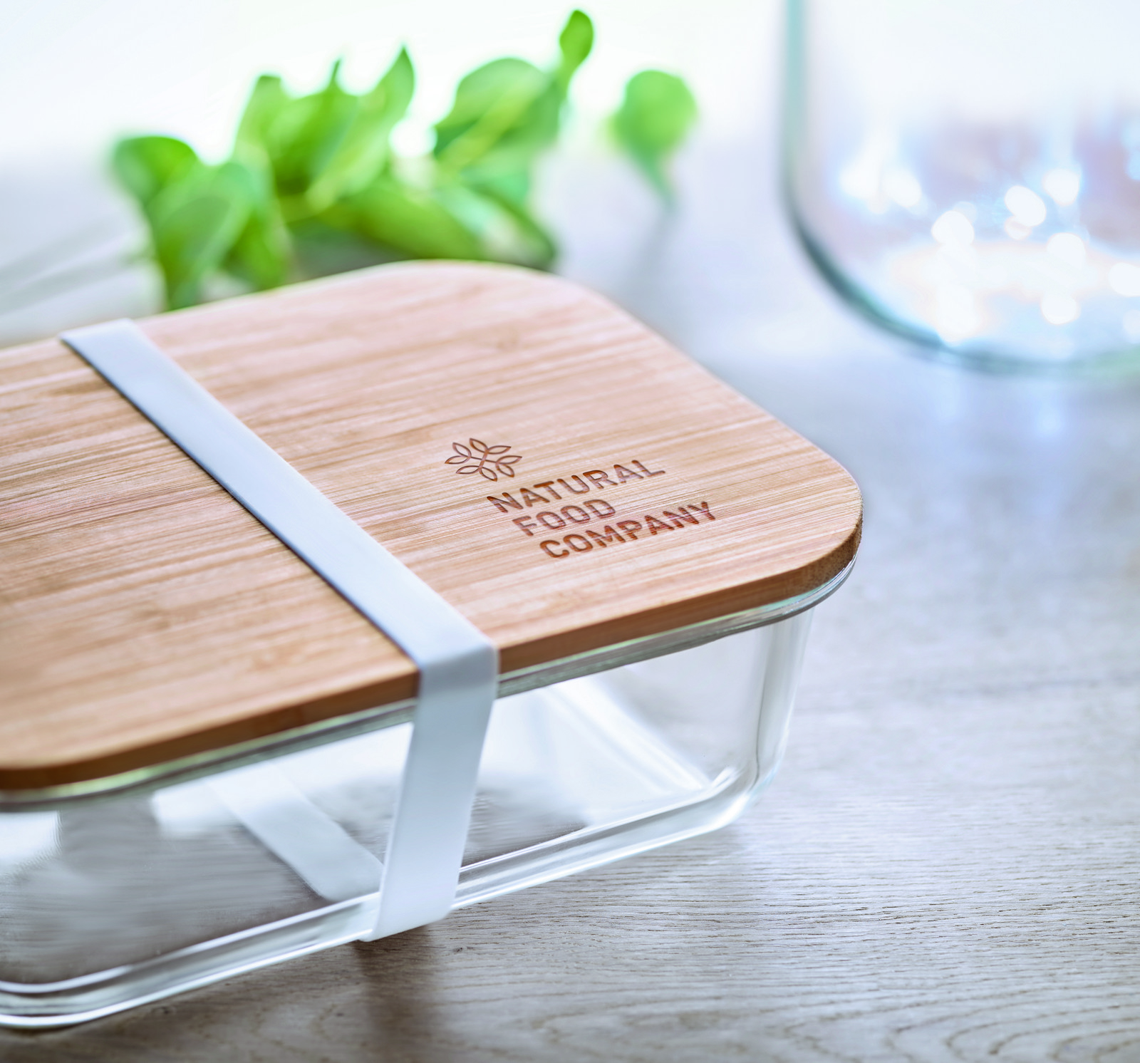 Klaasist lõunakarp, millel on stiilne bambuskaas ja praktiline silikoonpael. Selle mahutavus on 800 ml, mis sobib ideaalselt toidu kaasavõtmiseks. Bambus on looduslik ja keskkonnasõbralik materjal, seega on iga ese unikaalne oma värvitoonide ja suuruse poolest, mis võib veidi varieeruda ja mõjutada lõppviimistlust. Telli see lõunakarp ja kanna oma logo sellel, et reklaamida oma brändi igapäevaelus!