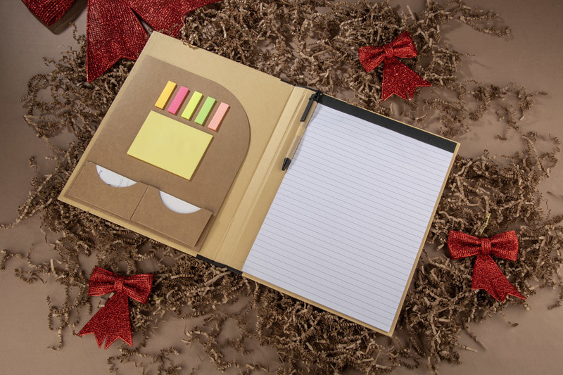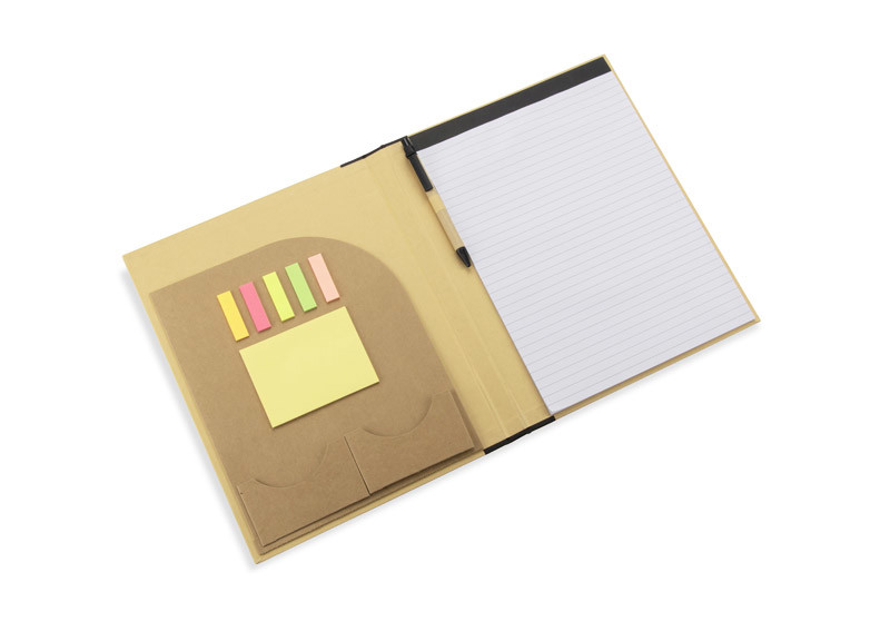 DOSI A4 konverentsikaust on mitmekülgne ja praktiline abivahend, mis sobib ideaalselt ärikohtumisteks ja konverentsideks. Kaust sisaldab voodriga märkmikku, dokumenditaskut ning kahte väiksemat taskut visiitkaartide ja märkmete jaoks. Polsterdatud kaust on varustatud paberist pliiatsi, kollaste kleepmärkmete ja komplekti väikeste kaartidega, mis on ideaalne oluliste kohtade märkimiseks märkmetes. DOSI kaust sulgub kindlalt kummipaelaga, et vältida dokumentide kadumist. Valmistatud paberist, mis on keskkonnasõbralik alternatiiv sünteetilistele materjalidele. Kausta saab kaunistada sinu logo või ettevõtte logoga, muutes selle suurepäraseks reklaamtooteks.