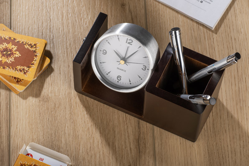 Elegantne metallist lauakell suurte valgete numbritega sihverplaadil, mis on paigaldatud kvaliteetsesse täispuidust puittoesse. See multifunktsionaalne kell ei ole mitte ainult ajamõõtja, vaid ka praktiline lahendus kontoritarvete hoidmiseks. NUTTO on suurepärane lisand igasse kontorisse, ühendades endas stiilse disaini ja kasulikud omadused. Kontoritarvete jaoks mõeldud puitosale on võimalik lisada sinu ettevõtte logo, muutes selle ideaalseks reklaamtooteks.