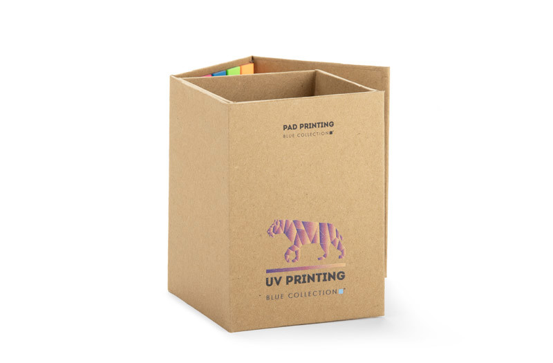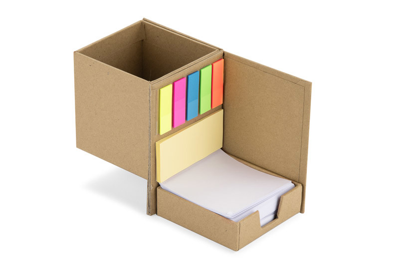 KOS lauahoidja on valmistatud jõupaberist ning pakub funktsionaalset lahendust teie kontoritarvete korraldamiseks. Kokkupanduna toimib see elegantse lauaalusena, hoides teie tööpinna korras ja organiseerituna. Avatuna sisaldab see kleepmärkide komplekti, kus on viis erinevat värvi fooliummarkerit (igaühes 25 tükki), keskmine kollane kleepuv märk (25 tükki) ning ligikaudu 200 lahtist lehte mõõtudega 72x72 mm, mis on mugavalt paigutatud spetsiaalsesse sektsiooni. KOS-i tööriistakast on varustatud ka kustutatava markeriga, mis võimaldab teha märkmeid ja suurendab toote funktsionaalsust. Tänu brändinguvõimalustele saate sellele lisada oma logo või muu reklaamteksti, muutes selle ideaalseks tööriistaks teie brändi tutvustamiseks.