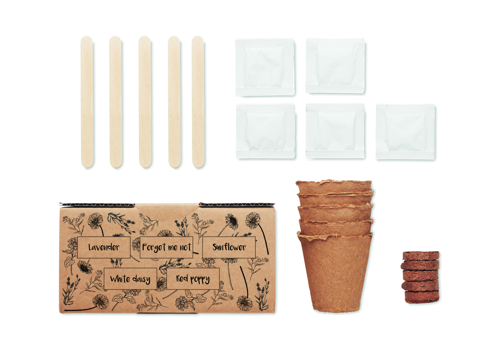 Avasta lillede kasvatamise rõõm meie komplekti abil, mis sisaldab kõike vajalikku ilusate lillede kasvatamiseks! Komplektis on lavendli, unustamata mind (Myosotis), päevalille (Helianthus debilis), valge karikakra ja punaste mooniseemnete seemned. Kõik tooted on valmistatud Euroopa Liidus ja komplektiga tuleb kaasa mugav mullatablett, mis lihtsustab kasvatamisprotsessi. Lisa oma logo pakendile ja too ettevõtte brändi lilled loodusesse!