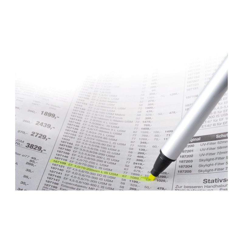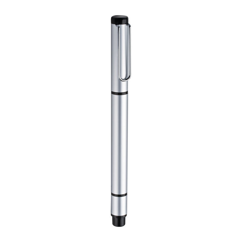 Aluminium ballpoint pen featuring a black ink refill, complemented by a yellow highlighter on the reverse end.