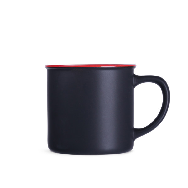 Väikese välimusega, kuid suure mahutavusega keraamiline kruus, millel on mattmust väliskuju ja värviline sisemus.