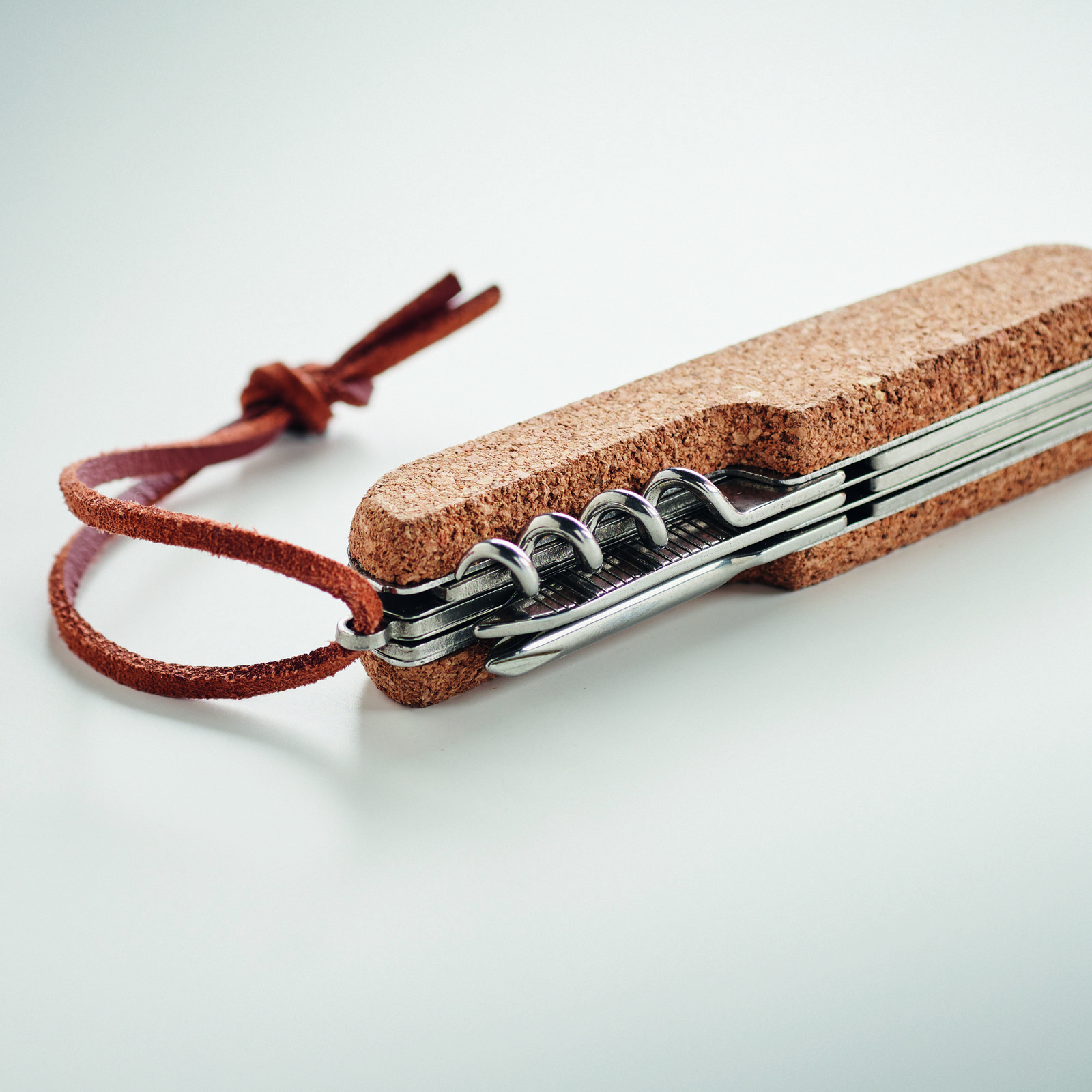 Roostevabast terasest valmistatud multifunktsionaalne taskunuga, millel on korkkatte ja PU-juhtme disain. See praktiline tööriist sisaldab seitset funktsiooni: kaks avajat, nuga, käärid, Philipsi otstega kruvikeeraja, viil ja veiniavaja. Kork on looduslik toode, mistõttu võib ühe eseme värv ja suurus veidi erineda, mis võib mõjutada lõppviimistlust. Lisa oma logo sellele kasulikule tööriistale ja too oma bränd lähemale!