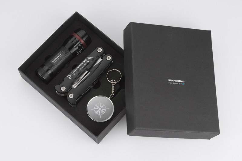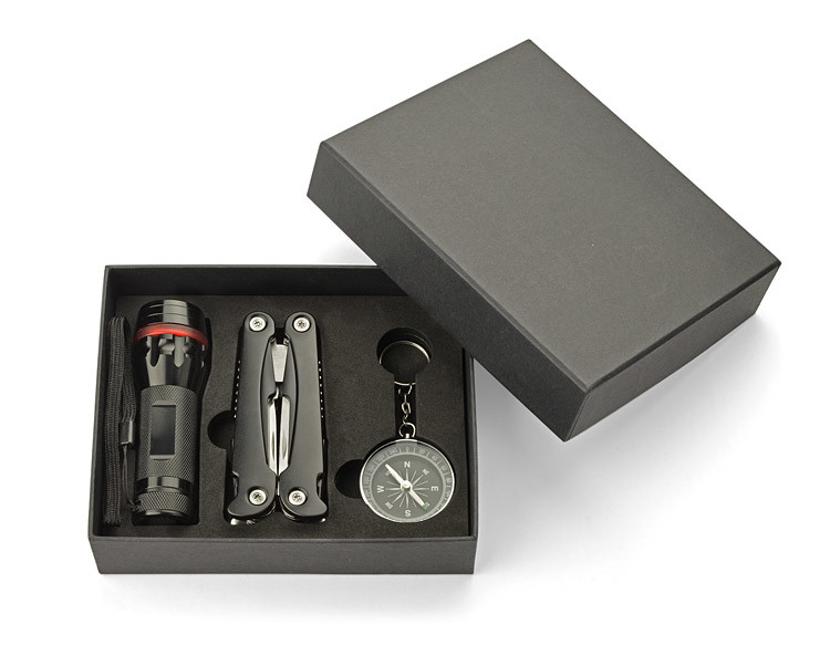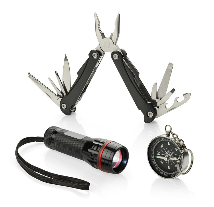 See praktiline kinkekomplekt sisaldab taskulampi, multitööriista ja kompassi, mis on ideaalne kaaslane igasugustes seiklustes. Taskulamp on varustatud ereda dioodiga, millel on reguleeritav valgusvihk (suumifunktsioon) ja kolm erinevat valgusrežiimi: tugev, nõrk ja vilkuv. Iga toote element on valmistatud kvaliteetsest metallist, tagades vastupidavuse ja pikaajalise kasutuse. Komplekt on elegantsetes mustades karpides, mistõttu sobib suurepäraselt kingituseks või oma ettevõtte logoga reklaamtoodete jaoks.