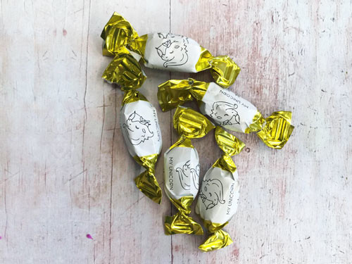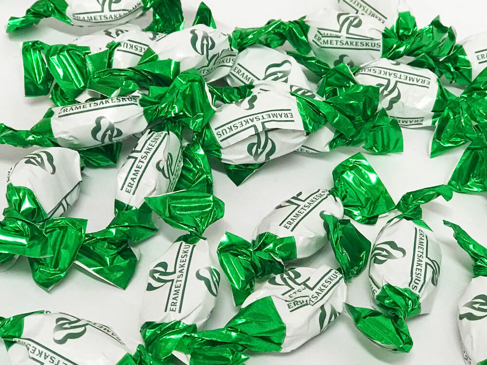 Puuviljakommid mitmevärvilise reklaamtrükiga. Segu apelsini, kirsi ja sidruni maitsetest. Saadaval alates 5kg-st