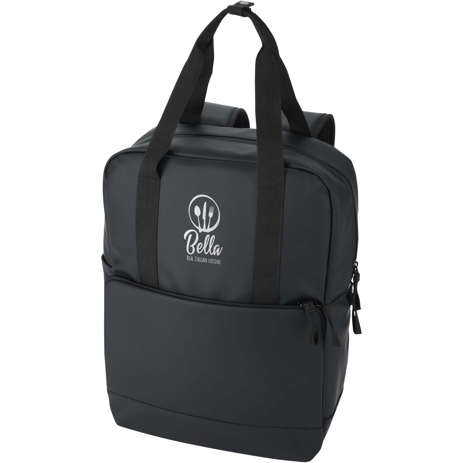 Made from GRS certified recycled PU leather with a matching RPET lining, this 18-litre backpack cooler backpack is designed for outdoor adventures. The spacious main compartment is insulated with high-quality PEVA lining and thick PE foam to keep food and drinks cool, while elastic webbing loops securely hold a bottle of wine. A large padded front zip pocket provides extra protection, and an open side pocket offers quick access to a drink bottle. For comfort, the bag includes breathable mesh on the back and adjustable and padded shoulder straps. Perfect for picnics, beach trips, and camping.