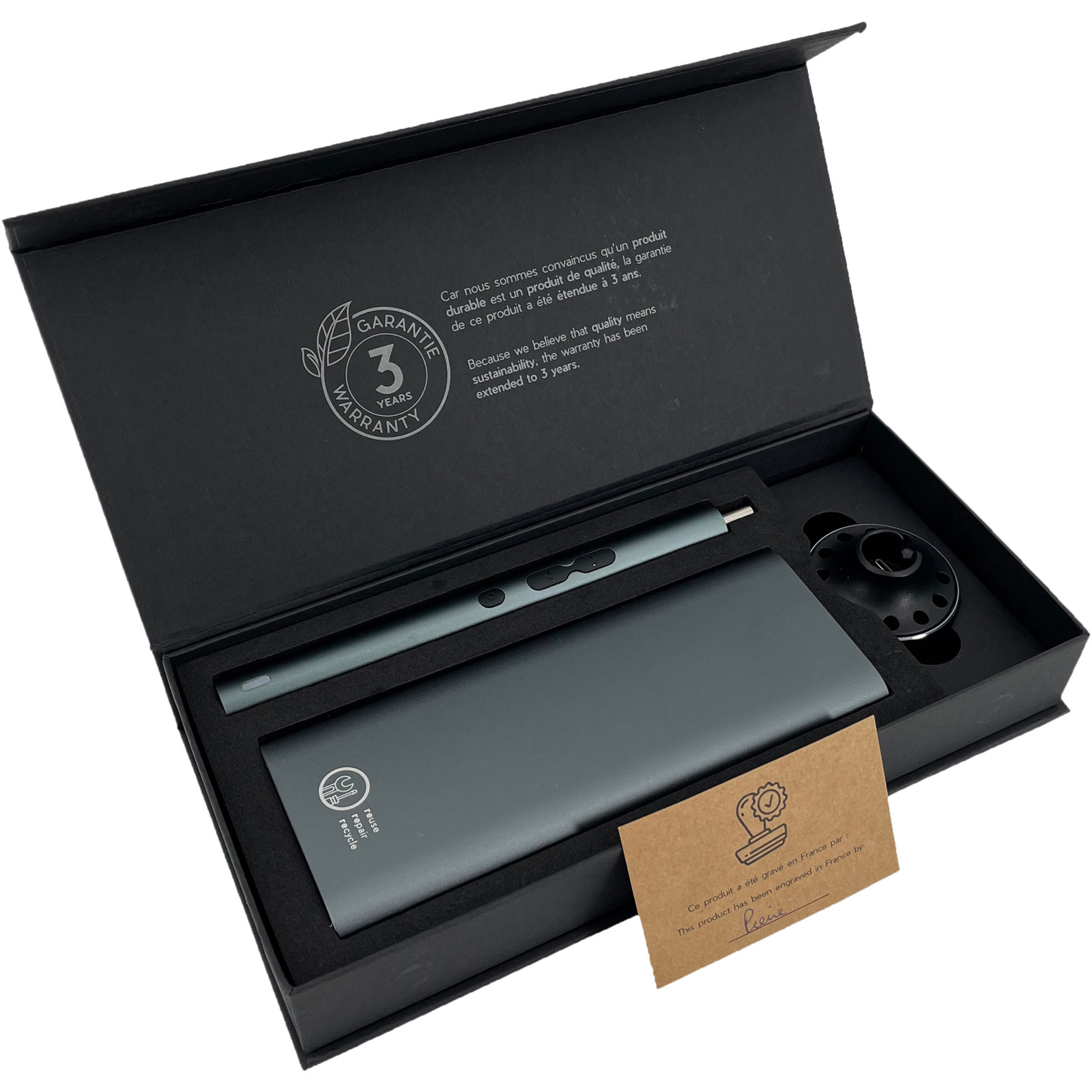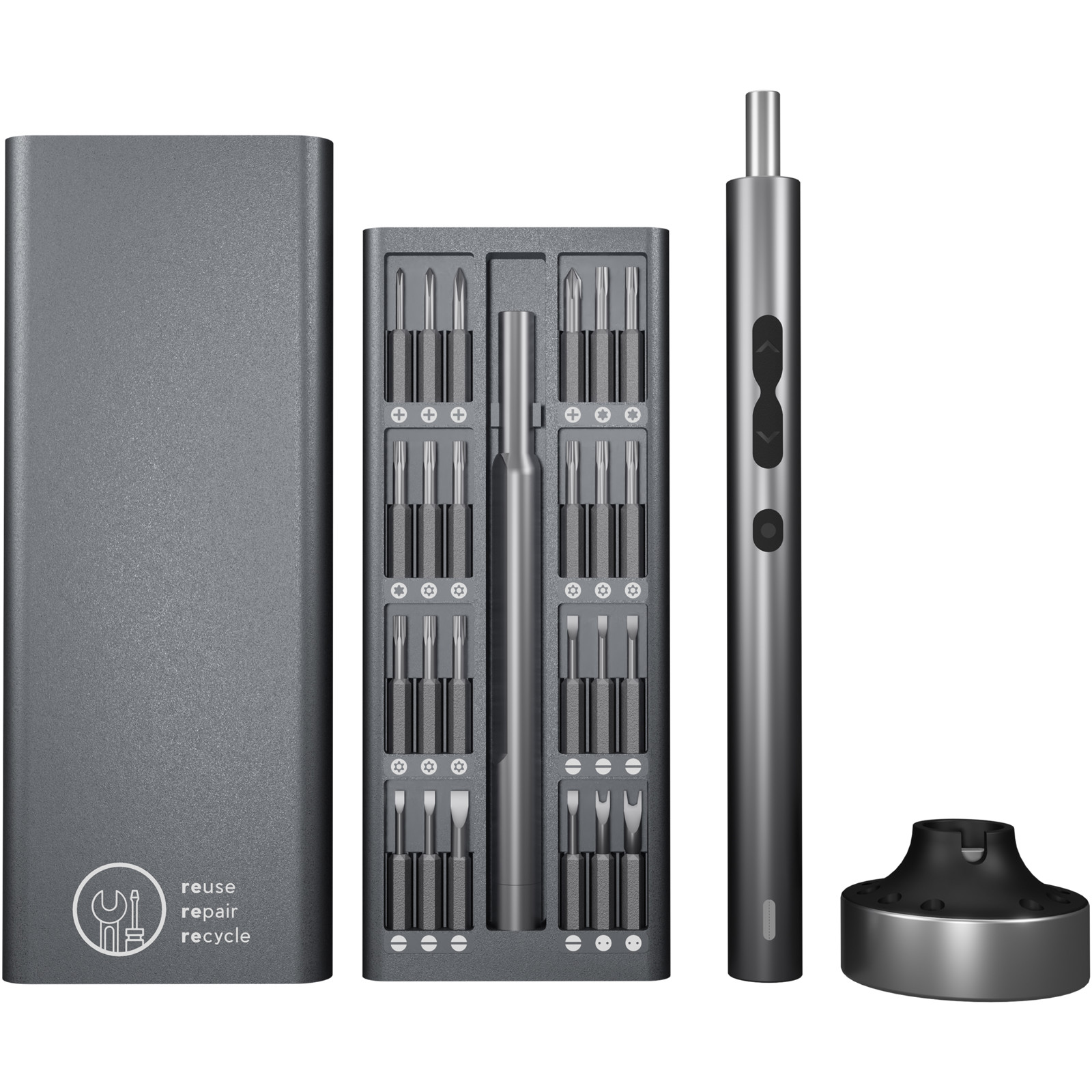 SCX.design T25 on multifunktsionaalne alumiiniumist elektriline kruvikeeraja komplekt, mis sisaldab 48-bitist käsitsi täppiskruvikeeraja komplekti, laadimisalust ja praktilist ümbrist, et hoida kõik vajalik ühes kohas. Magnetilised otsad kinnituvad lihtsalt kruvikeeraja külge, muutes nende käsitlemise mugavaks. Komplekti ühele küljele on graveeritud "REUSE REPAIR RECYCLE", samas kui teisele küljele saab trükkida sinu logo, muutes selle ideaalseks reklaamtooteks. Lai valik otsikuid muudab selle universaalseks erinevate isetegemise projektide jaoks. Tooted tarnitakse magnetsulguriga taaskasutatud paberist karbis ning komplektile kehtib 3-aastane garantii.