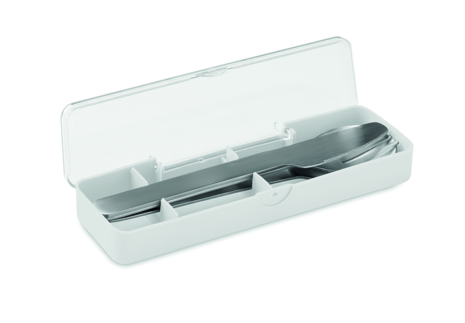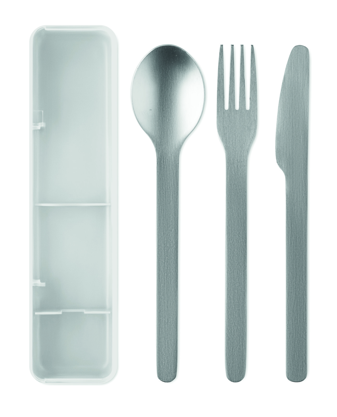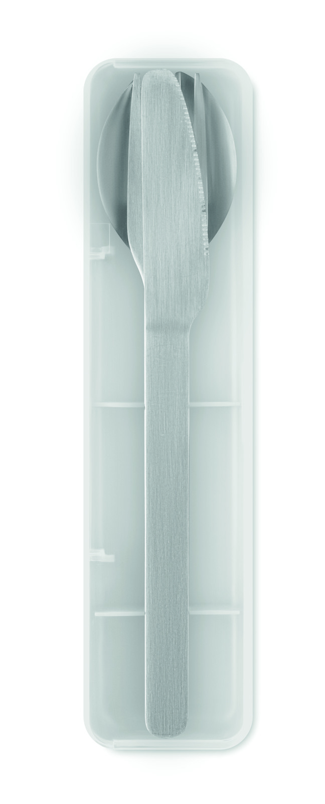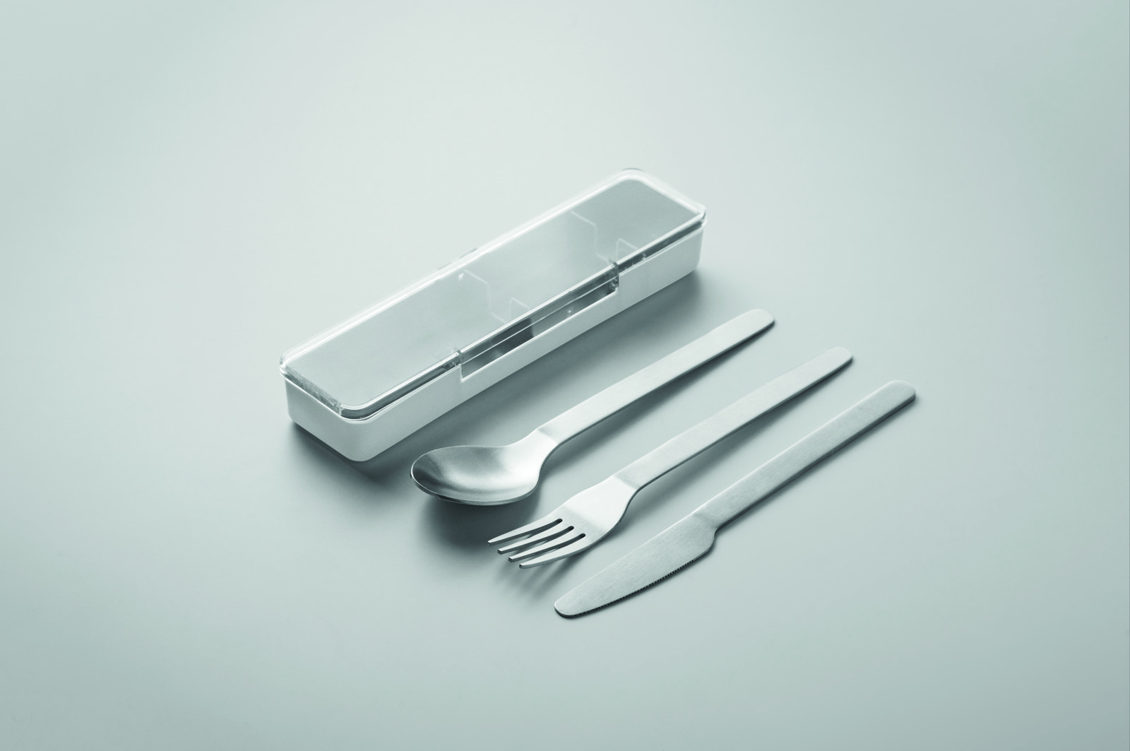 Stainless steel cutlery set with PP case. This set includes a fork, knife and spoon.