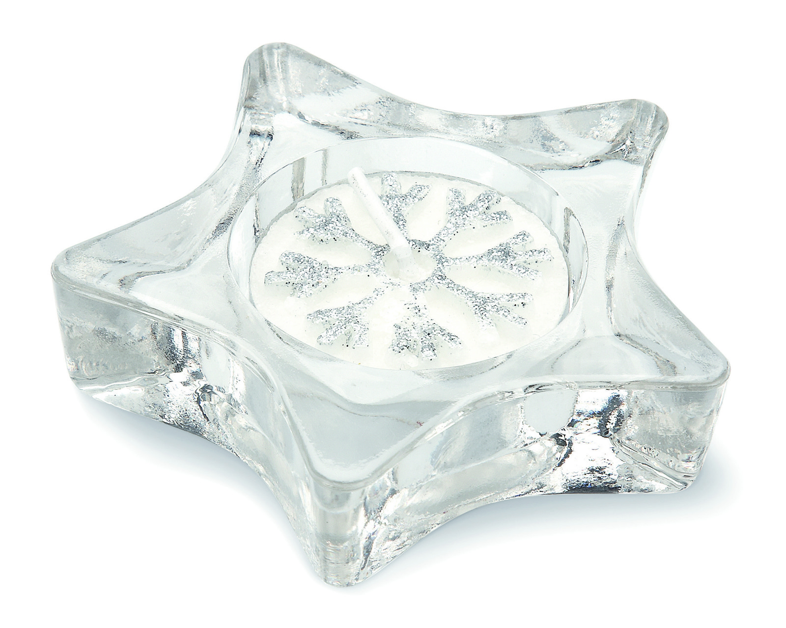 Tähekujuline klaasist teeküünlaalus, millel on läbipaistev kate ja dekoratiivne pael. Toode on pakendatud elegantse hõbedasesse karpi ning komplekt sisaldab ka teeküünalt. See stiilne küünlaalus sobib suurepäraselt sinu ettevõtte logoga, et lisada ruumile soojust ja isikupära. Ideaalne kingitus või dekoratiivne element, mis aitab tutvustada sinu brändi.